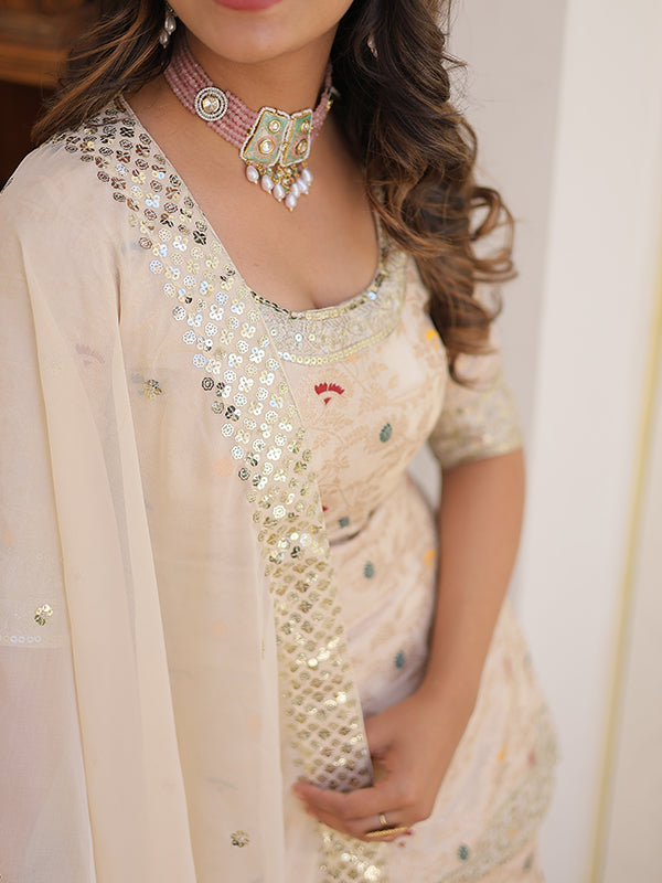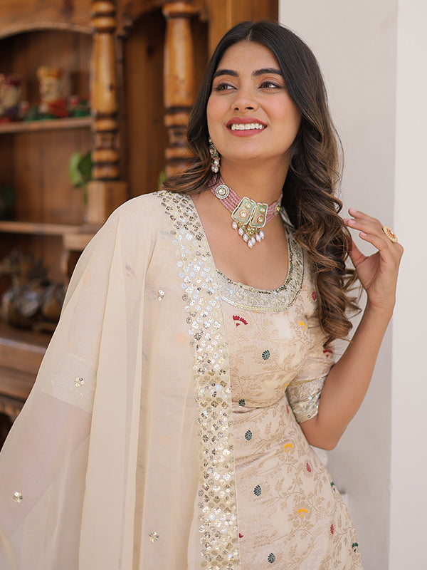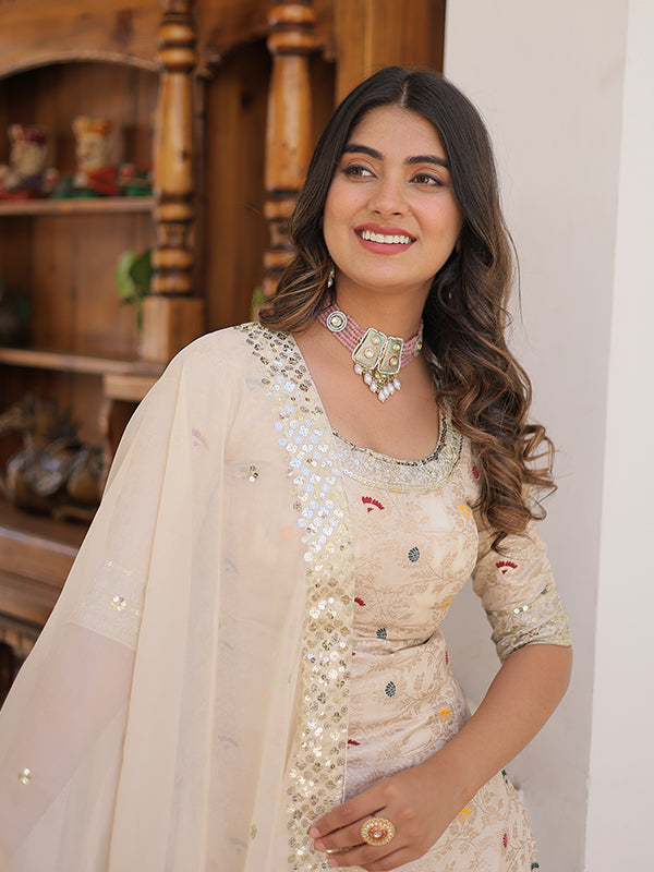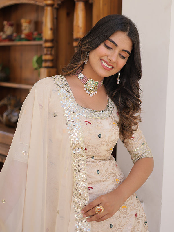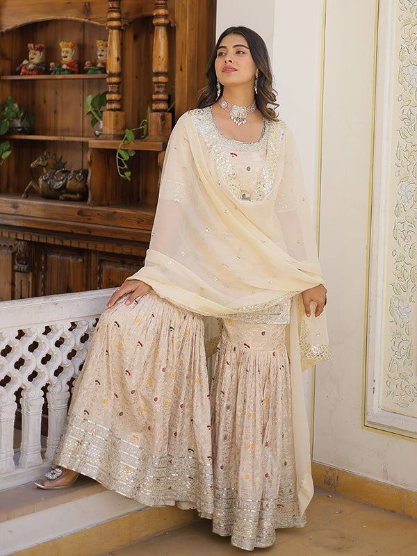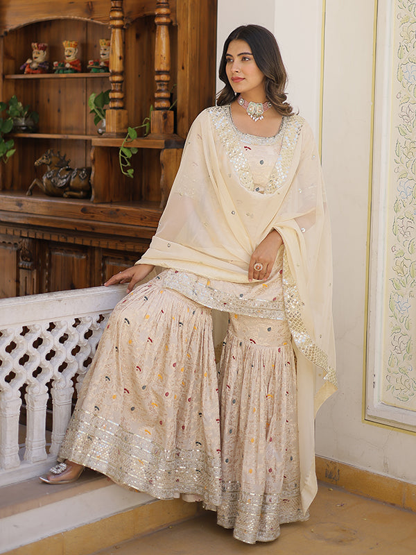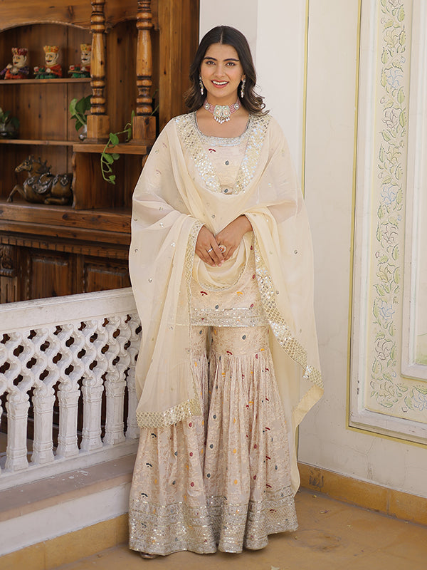 Beige Viscose Jacquerd Embroidered Kurta With Sharara & Dupatta – Vamikaa