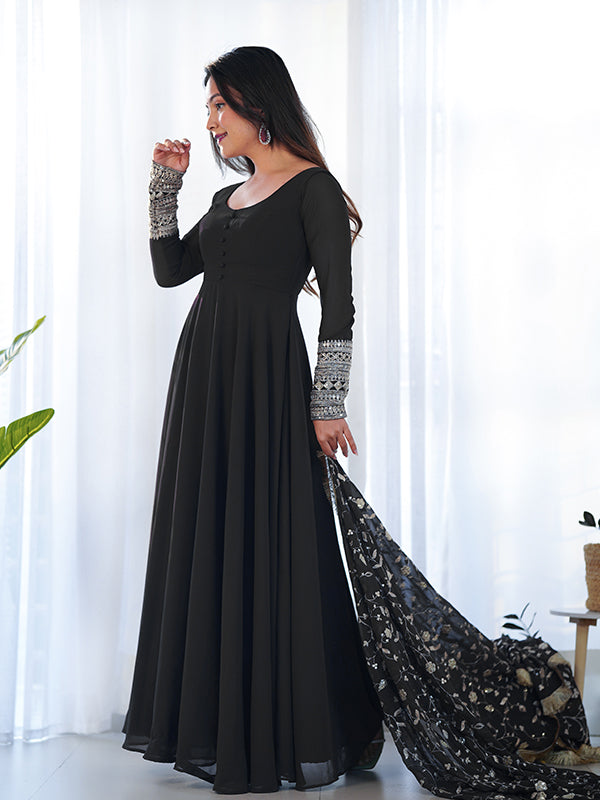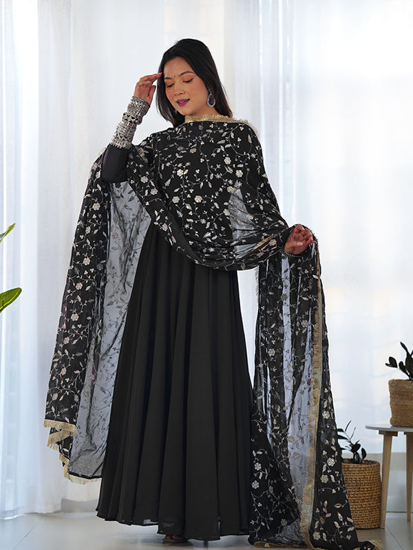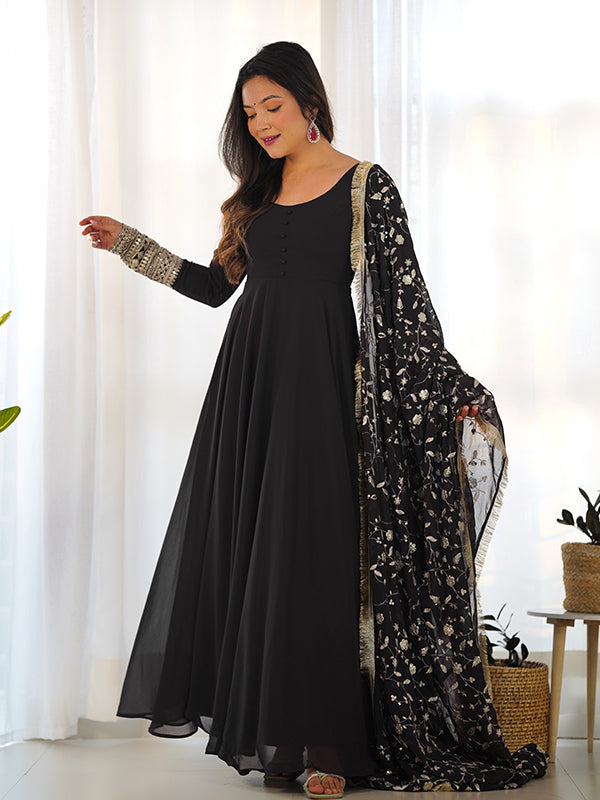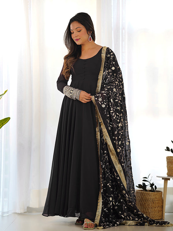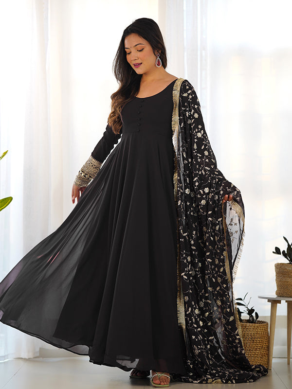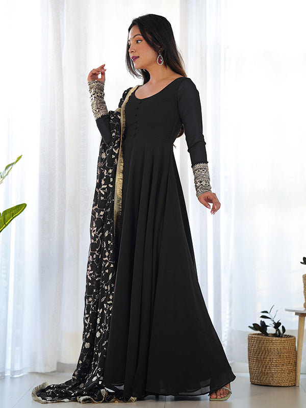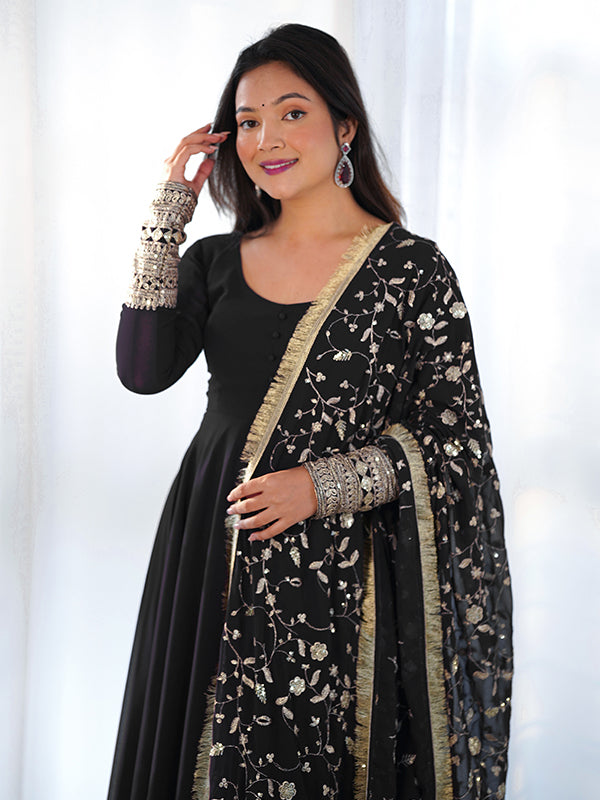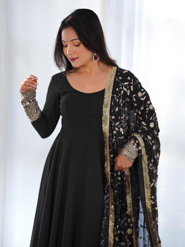 Black Anarkali Georgette Gown With Golden Dupatta Set