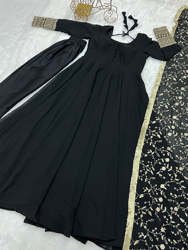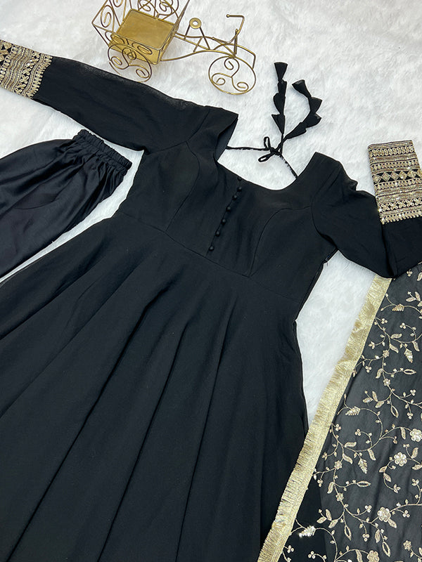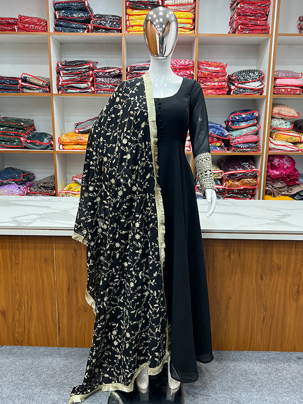 Black Anarkali Georgette Gown With Golden Dupatta Set Black Anarkali Georgette Gown With Golden Dupatta Set
