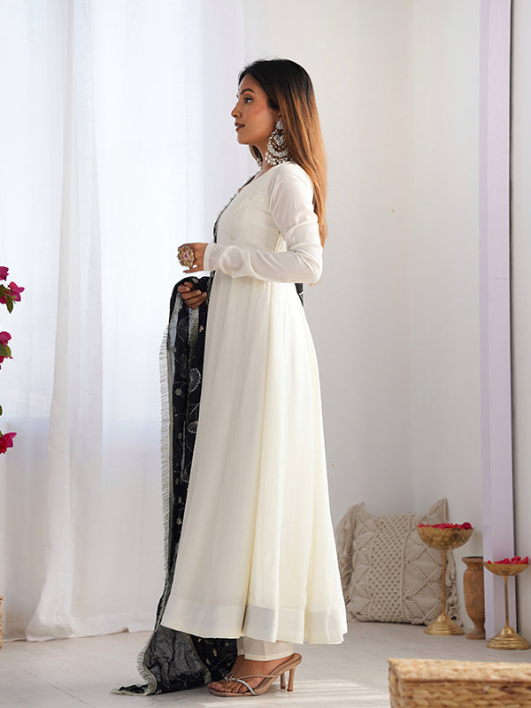 Black Dupatta Vichitra Silk Off White Anarkali Gown With Pant Set Black Dupatta Vichitra Silk Off White Anarkali Gown With Pant Set
