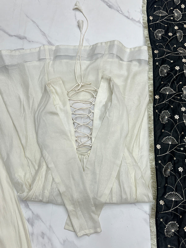 Black Dupatta Vichitra Silk Off White Anarkali Gown With Pant Set