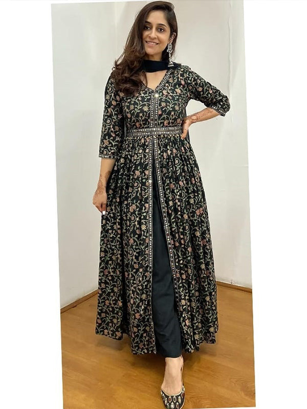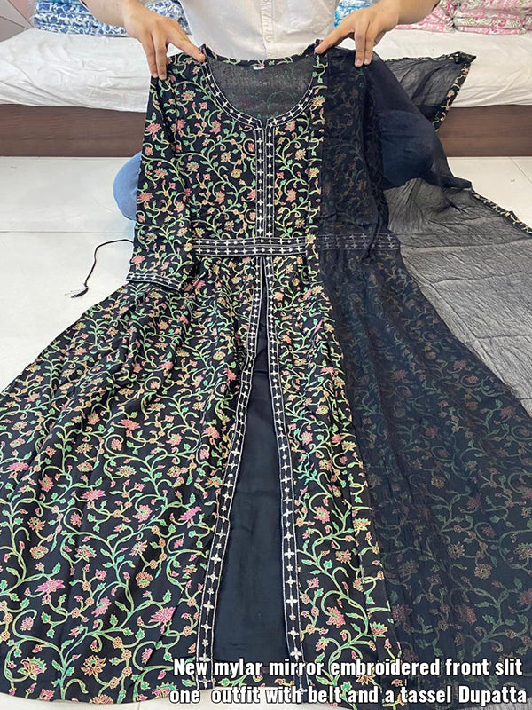 Black Embroidered Long One Piece With Belt & Dupatta – Vamikaa