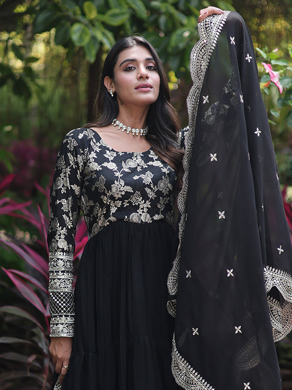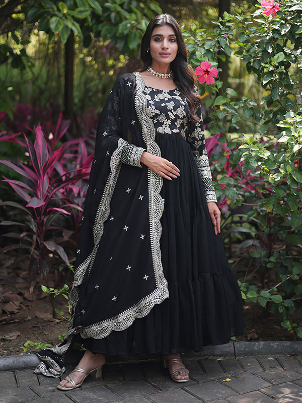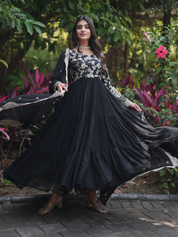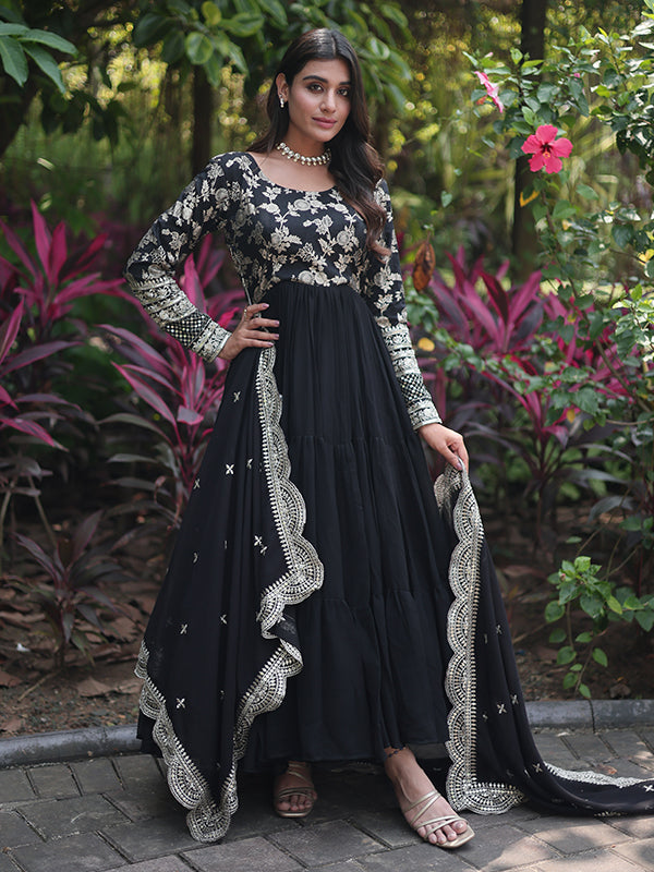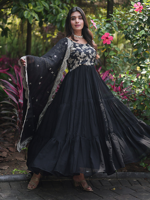 Black Viscose Sequins Embroidered Work Gown With Dupatta – Vamikaa