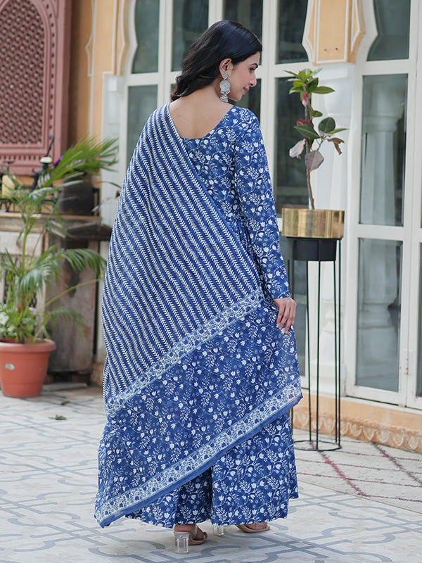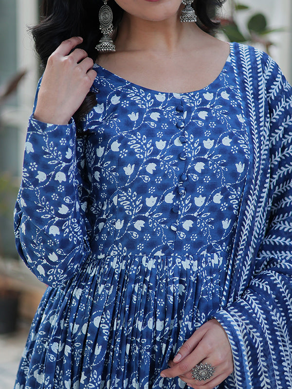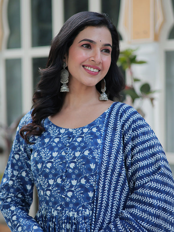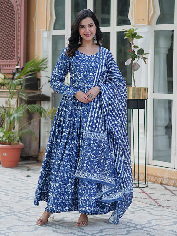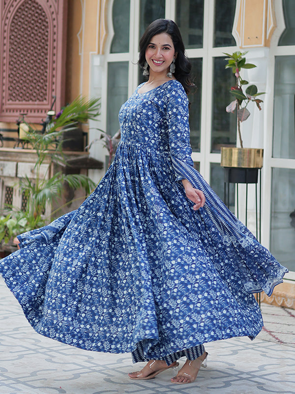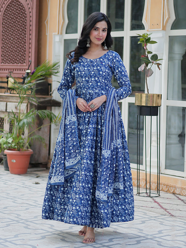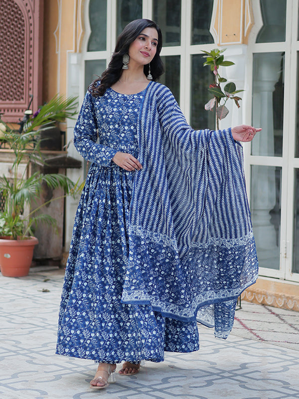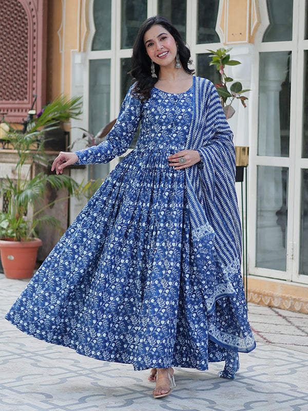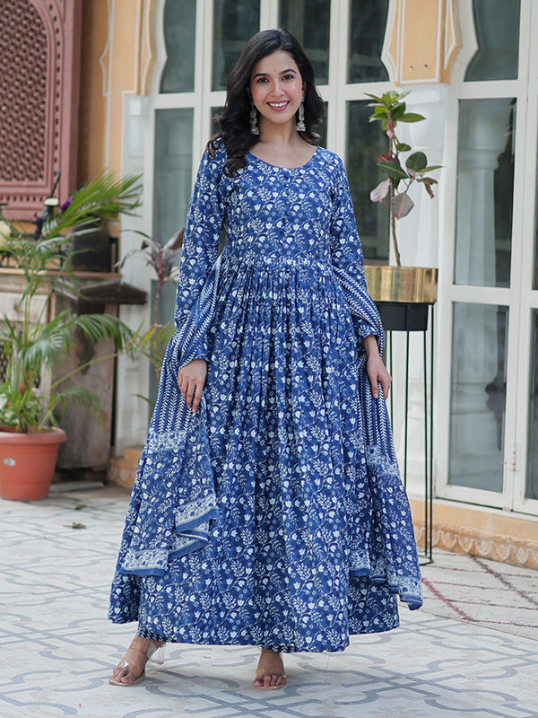 Blue Floral Printed Cotton Gown With Pant & Dupatta Set Blue Floral Printed Cotton Gown With Pant & Dupatta Set