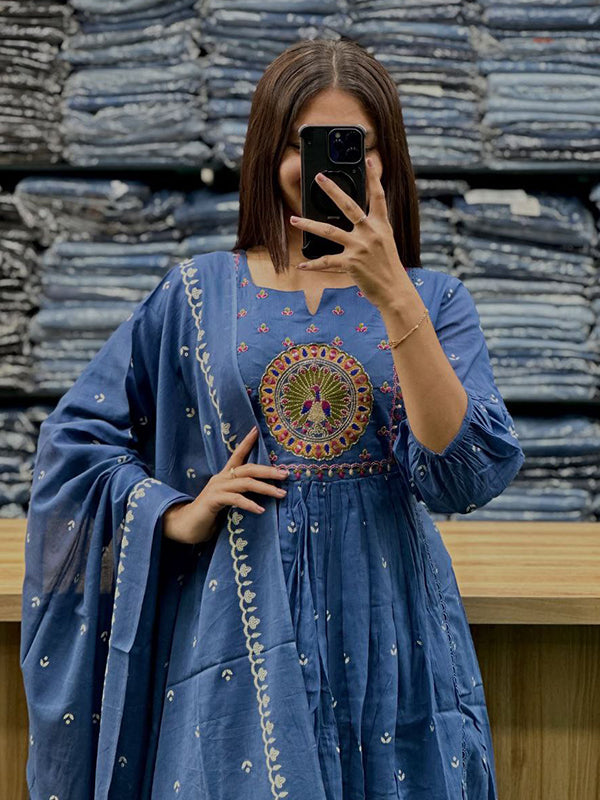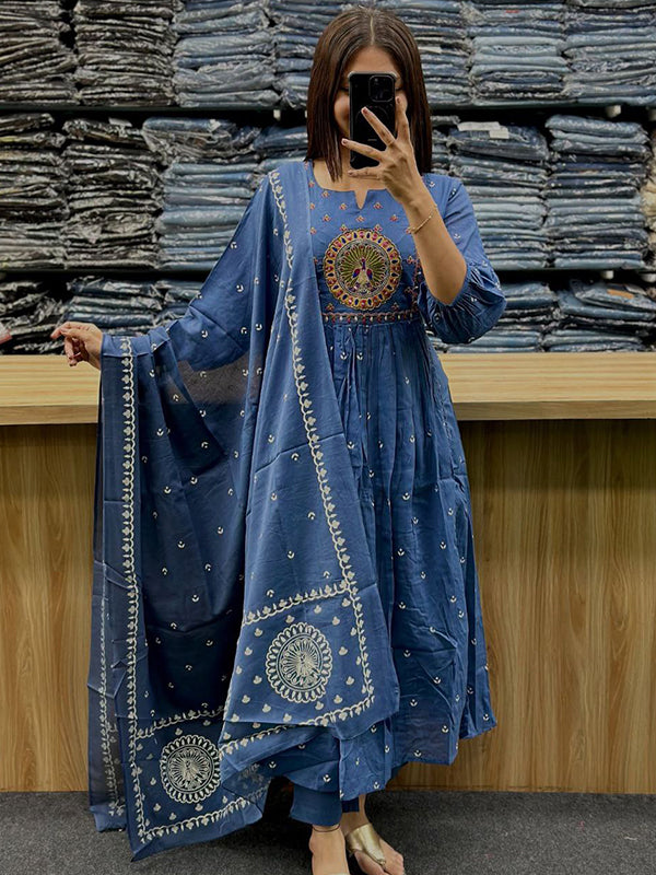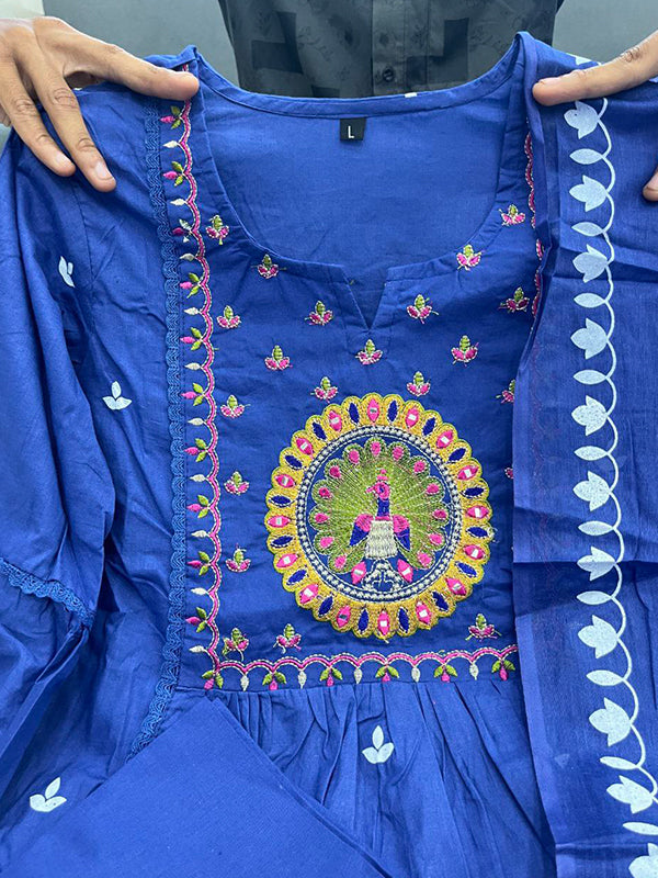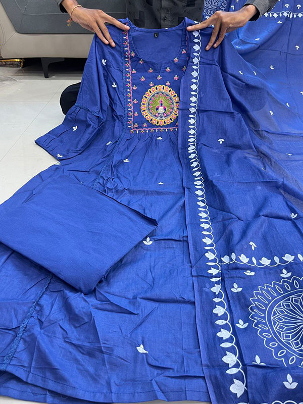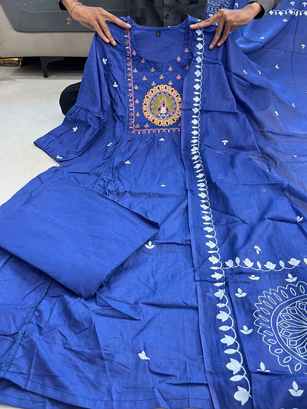 Blue Mal Cotton Pleated Kurti With Pant & Dupatta Set
