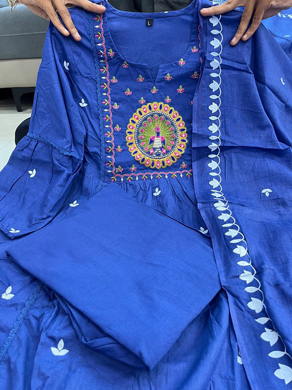Blue Mal Cotton Pleated Kurti With Pant & Dupatta Set Blue Mal Cotton Pleated Kurti With Pant & Dupatta Set