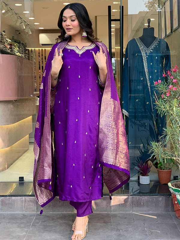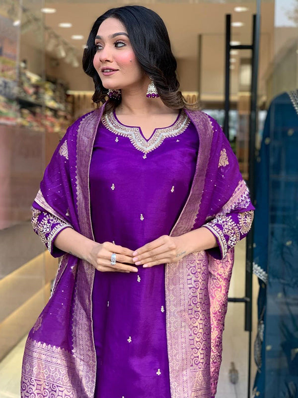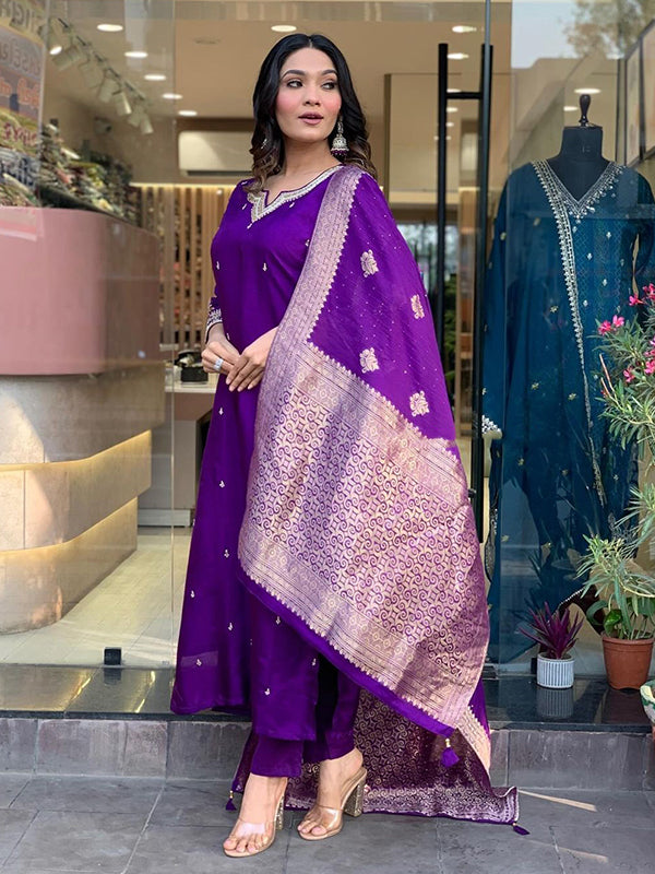 Designer Neck Hand Work Tapeta Silk Kurti With Pant & Dupatta Set – Vamikaa