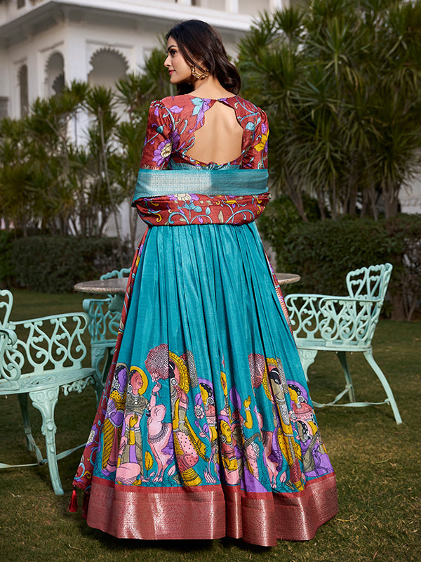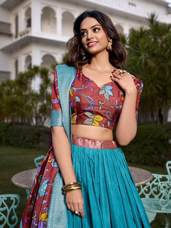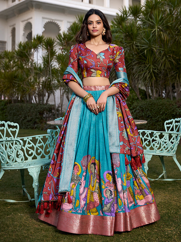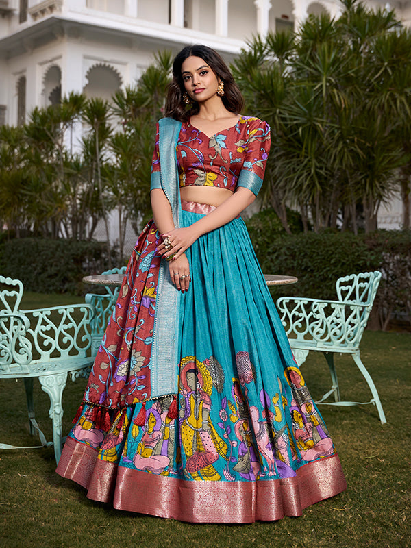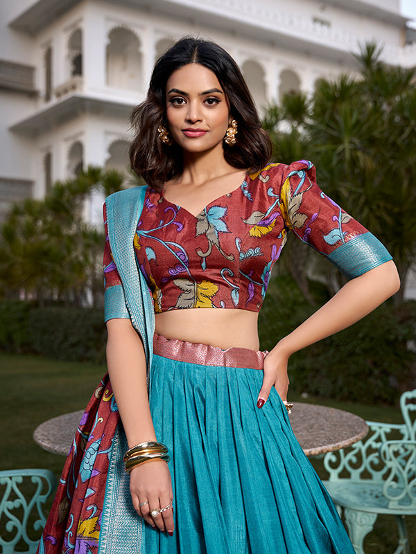 Firozi Kalamkari Print Silk Lehenga Choli With Dupatta – Vamikaa