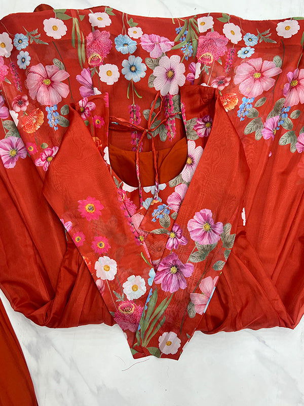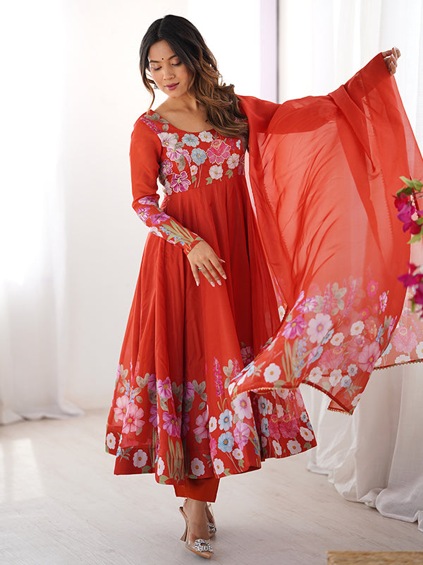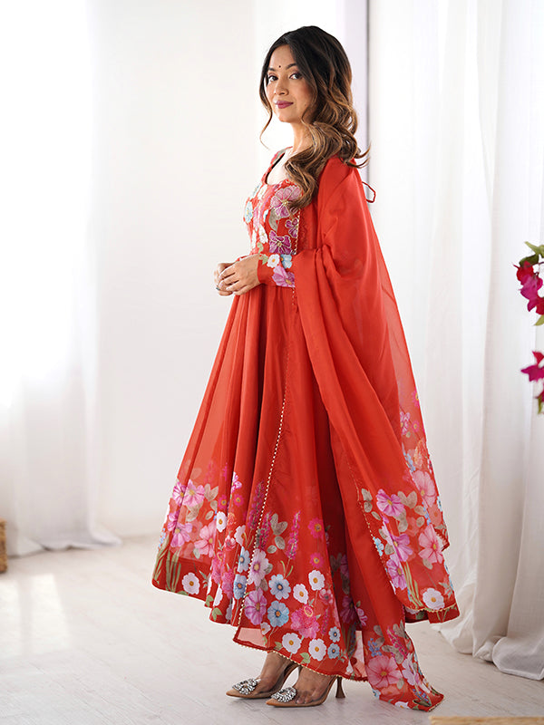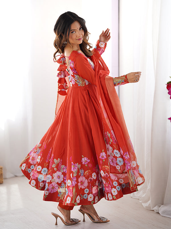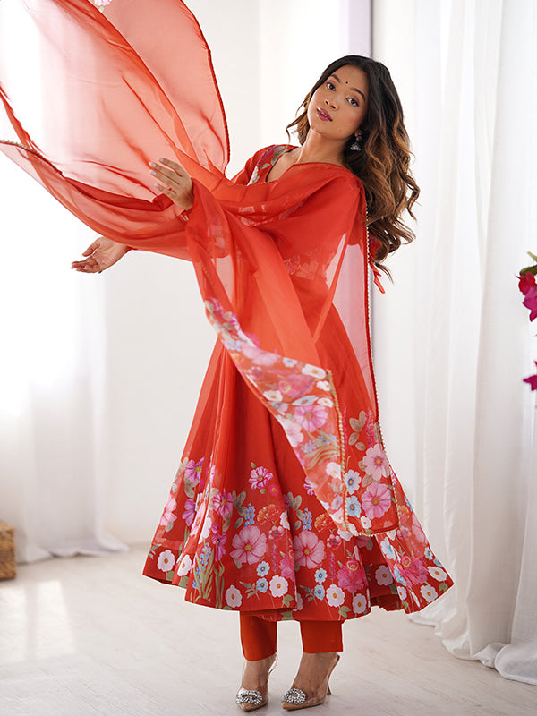 Flower Orange Printed Anarkali Gown With Pant & Dupatta Set – Vamikaa