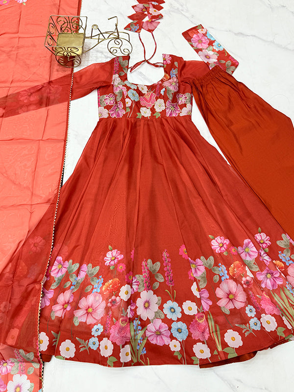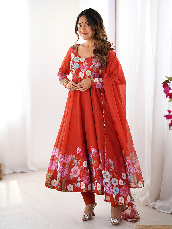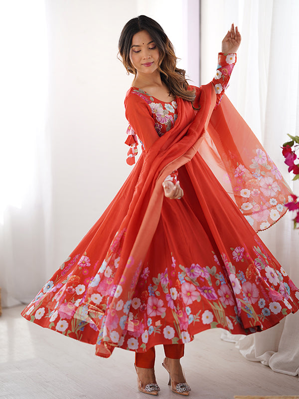 Flower Orange Printed Anarkali Gown With Pant & Dupatta Set