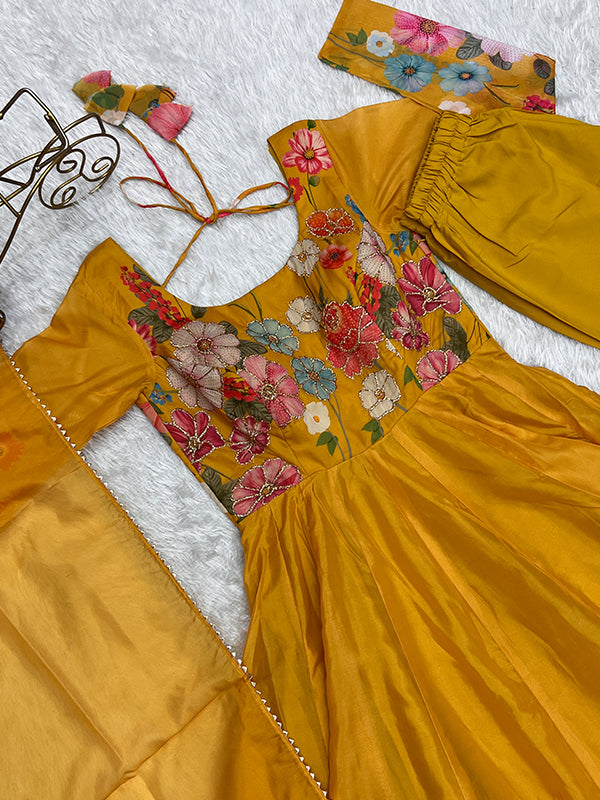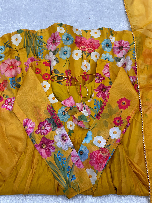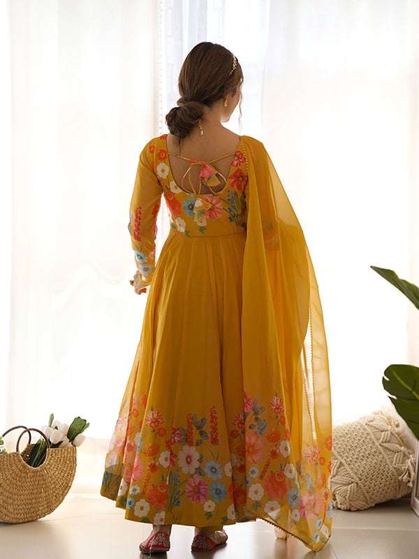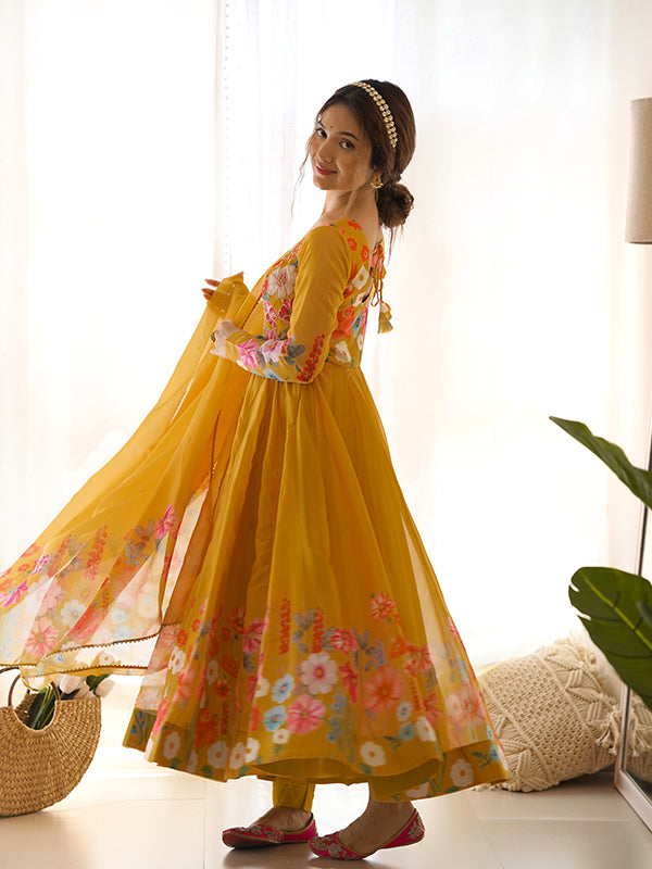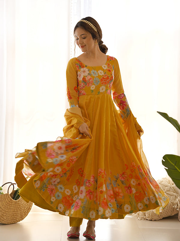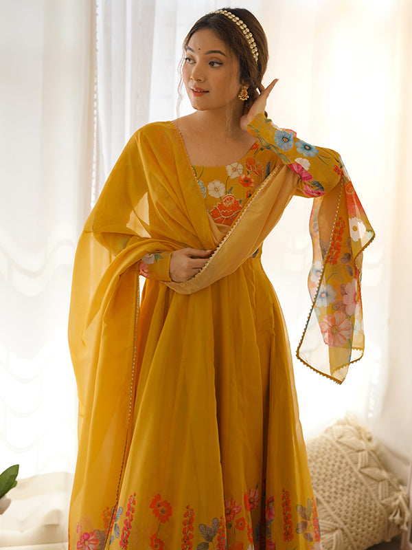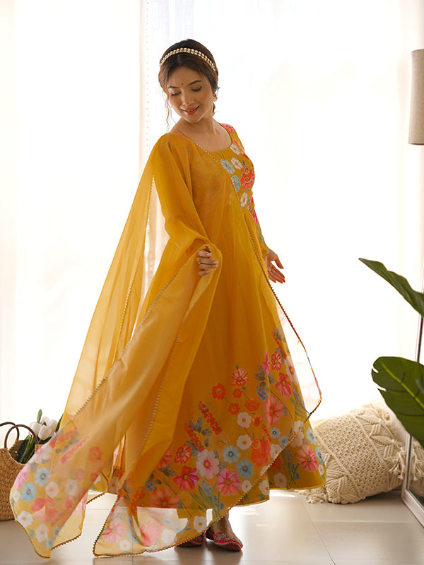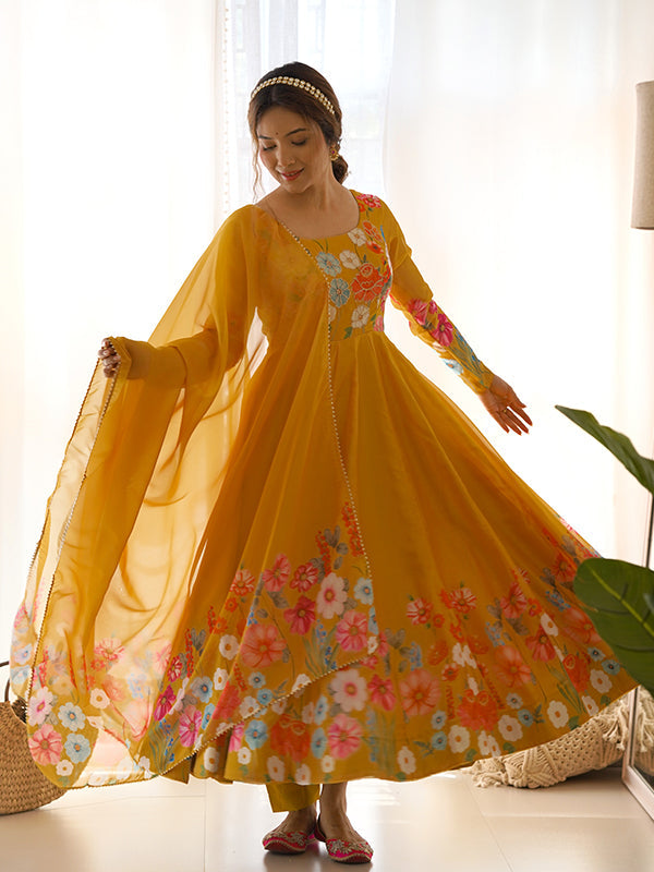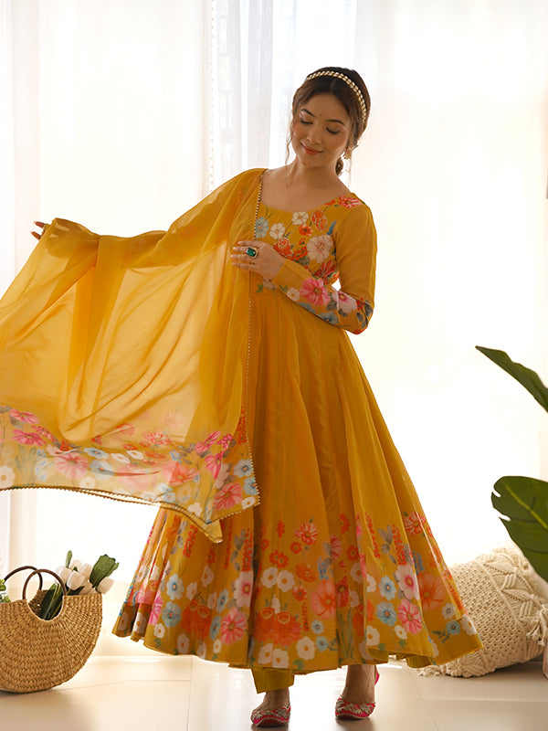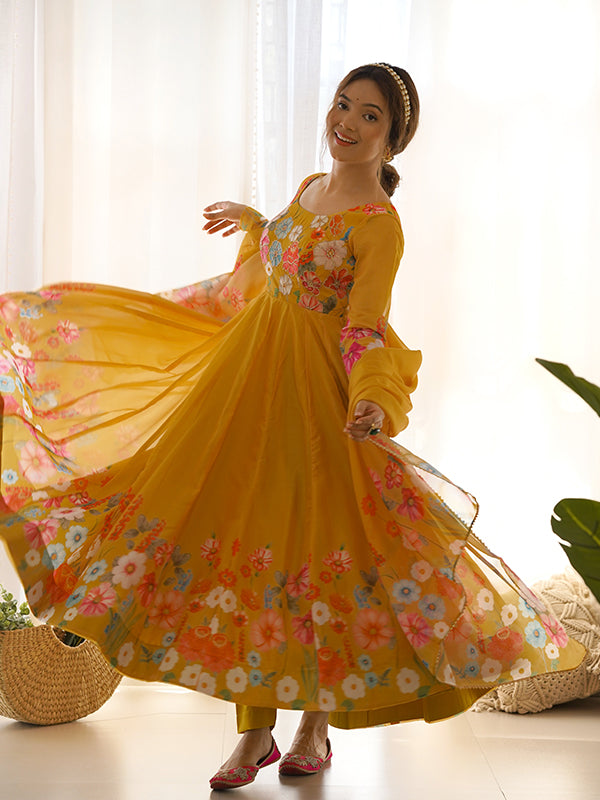 Flower Yellow Printed Anarkali Gown With Pant & Dupatta Set – Vamikaa