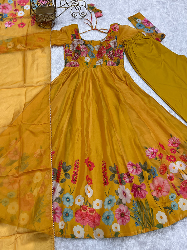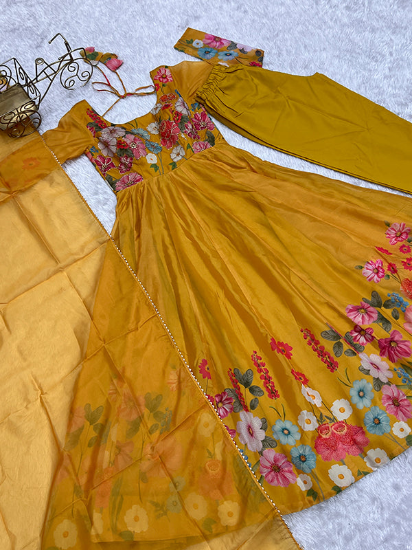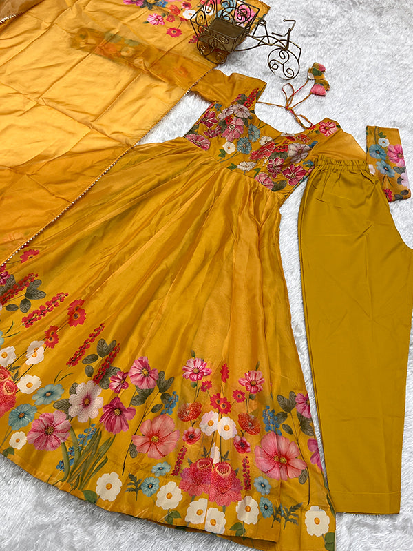 Flower Yellow Printed Anarkali Gown With Pant & Dupatta Set