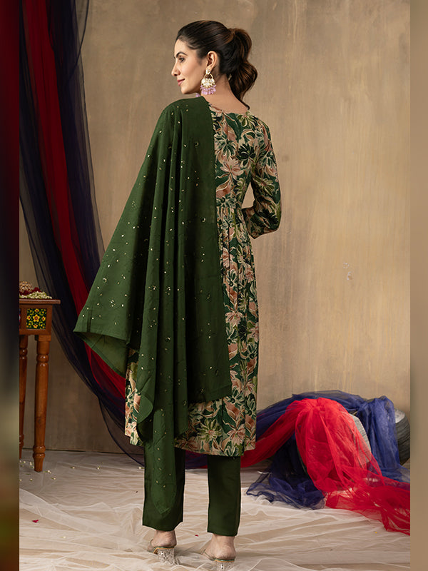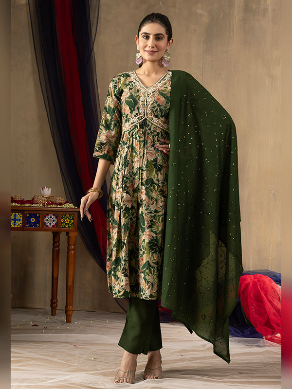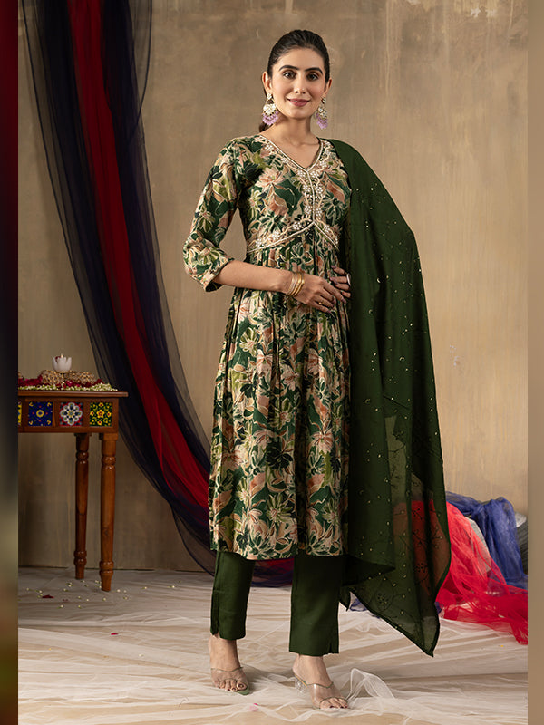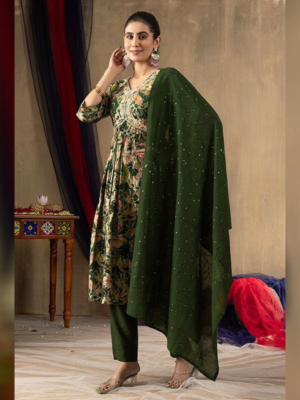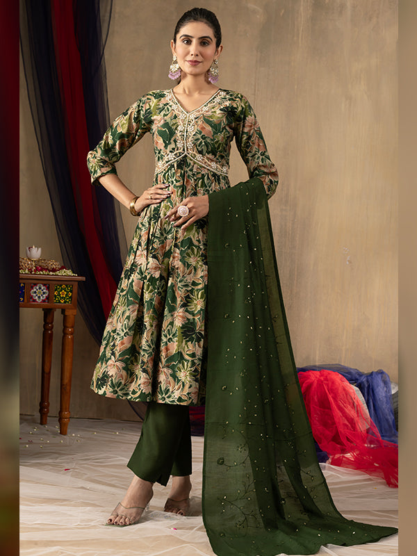 Green Alia Cut Embroidered With Hand Work Suit Set