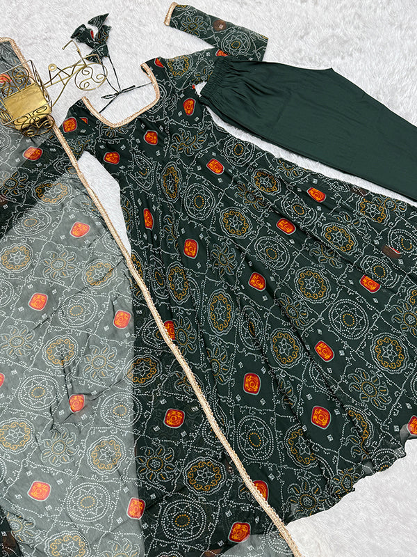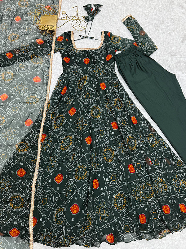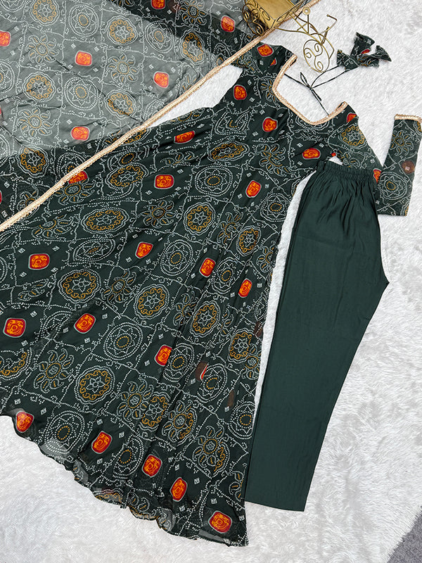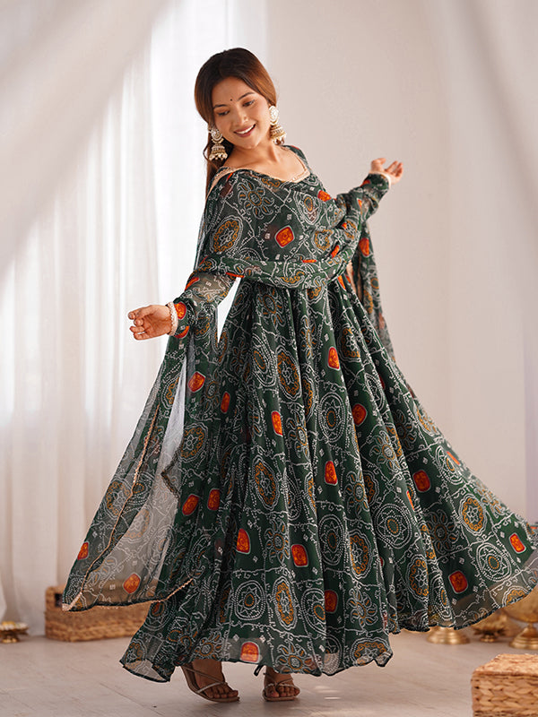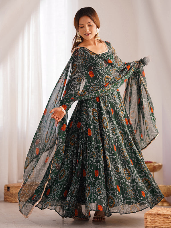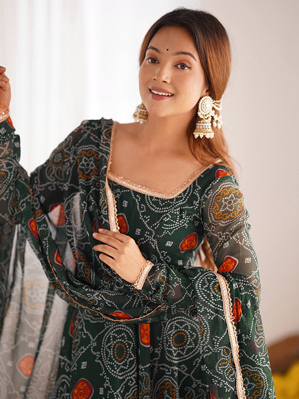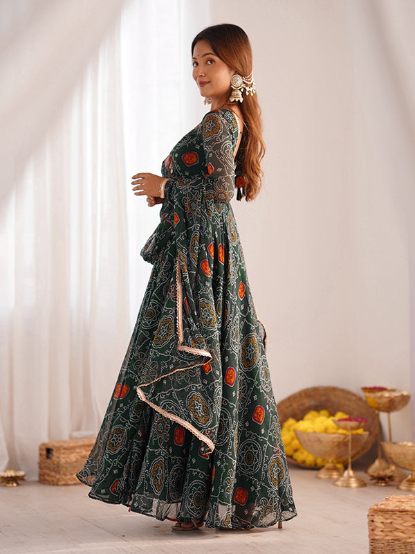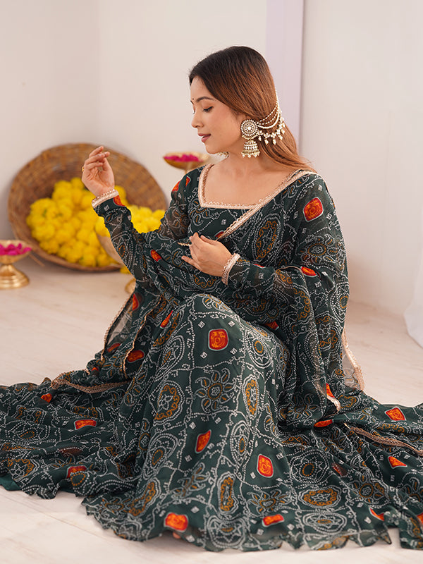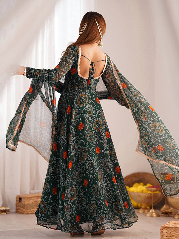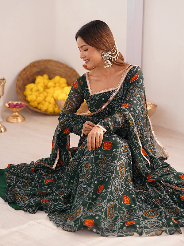 Green Bandhej Printed Anarkali Gown With Pant & Dupatta Set