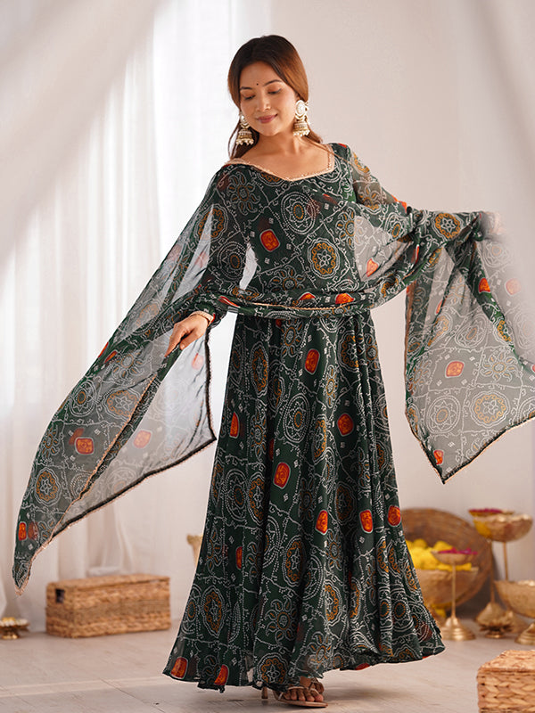 Green Bandhej Printed Anarkali Gown With Pant & Dupatta Set – Vamikaa