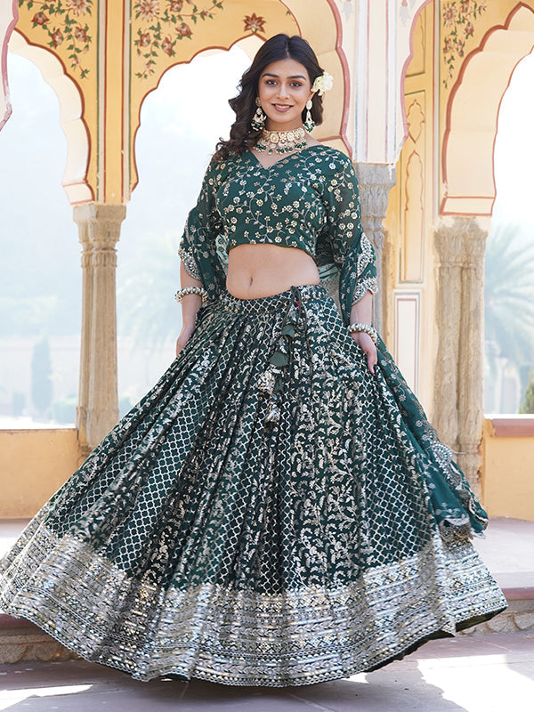 Buy Green Viscose Jacquard With Embroidered Sequins Lehenga Choli Online. This Lehenga Choli Is A Must Have In Every Woman's Wardrobe.