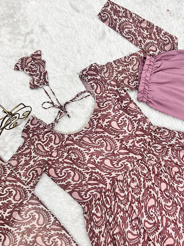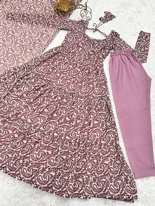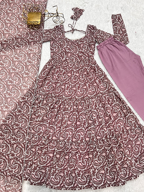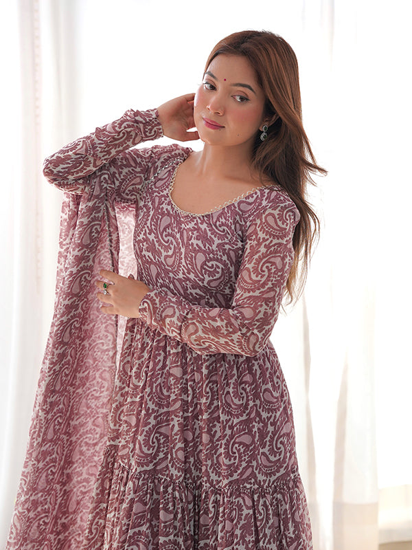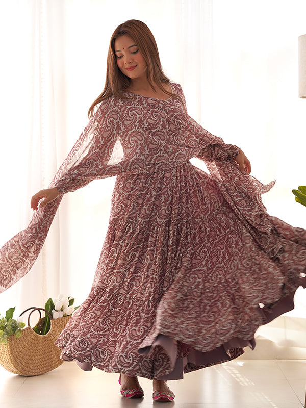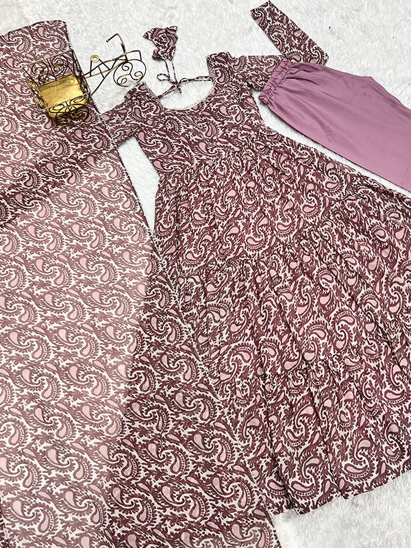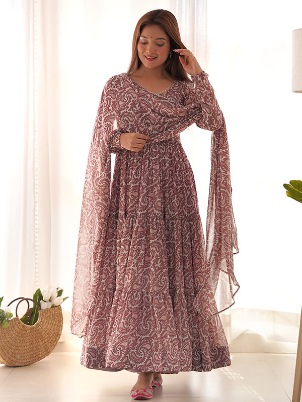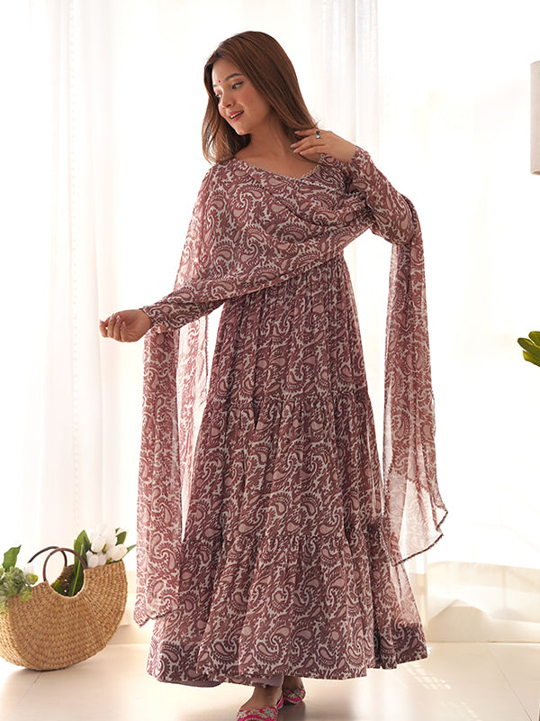 Layered Coffee Printed Anarkali Gown With Pant & Dupatta Set