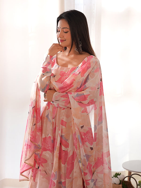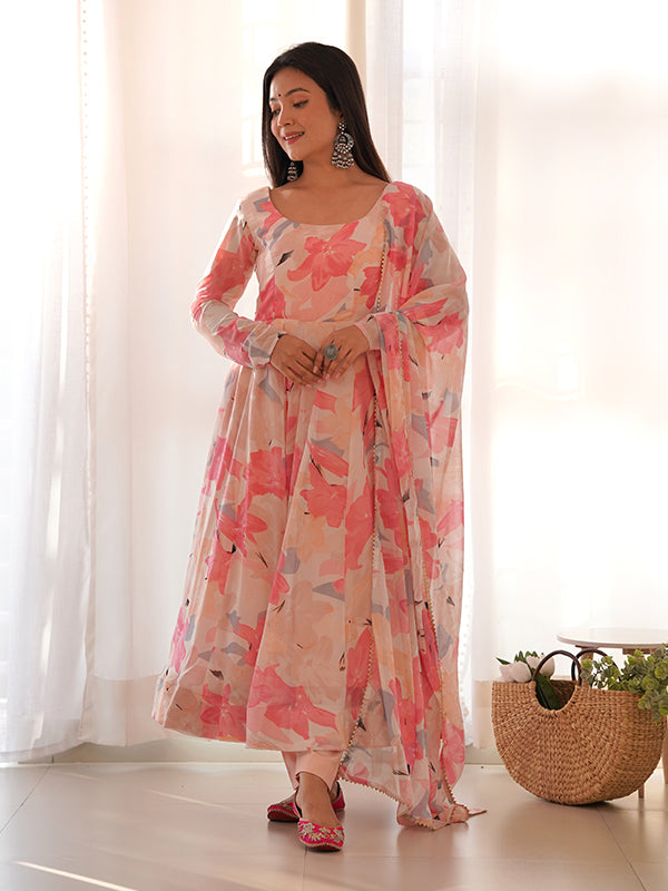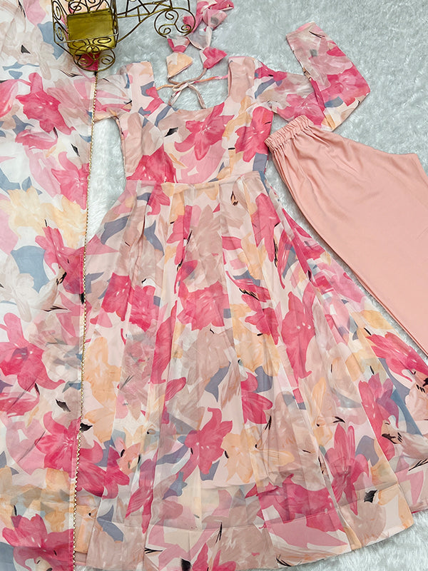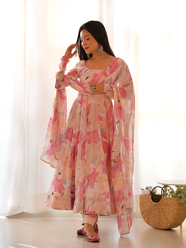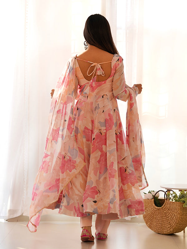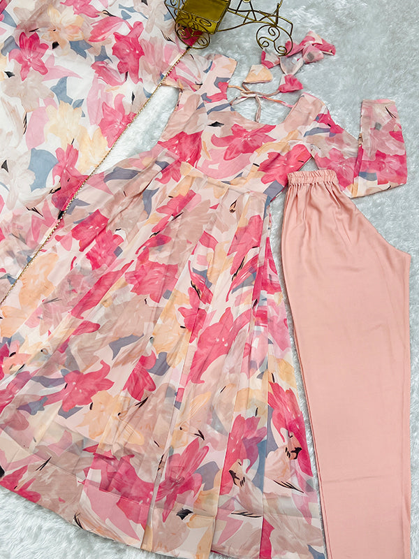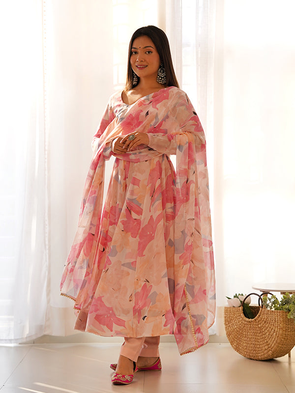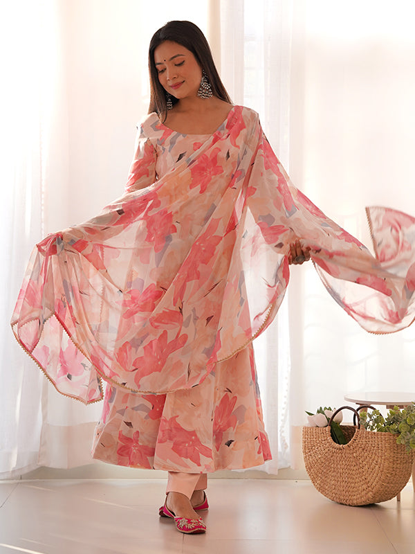 Light Pink Floral Printed Anarkali Kurti With Pant & Dupatta Set