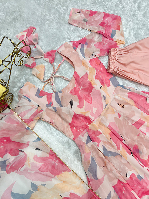 Light Pink Floral Printed Anarkali Kurti With Pant & Dupatta Set – Vamikaa