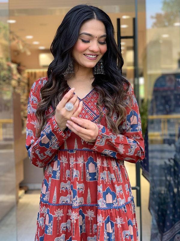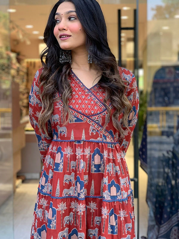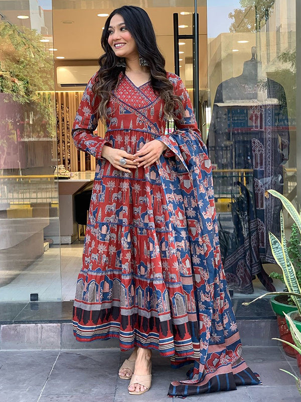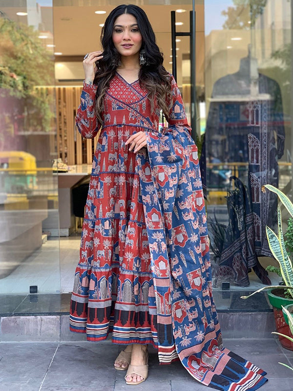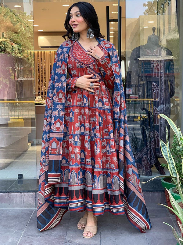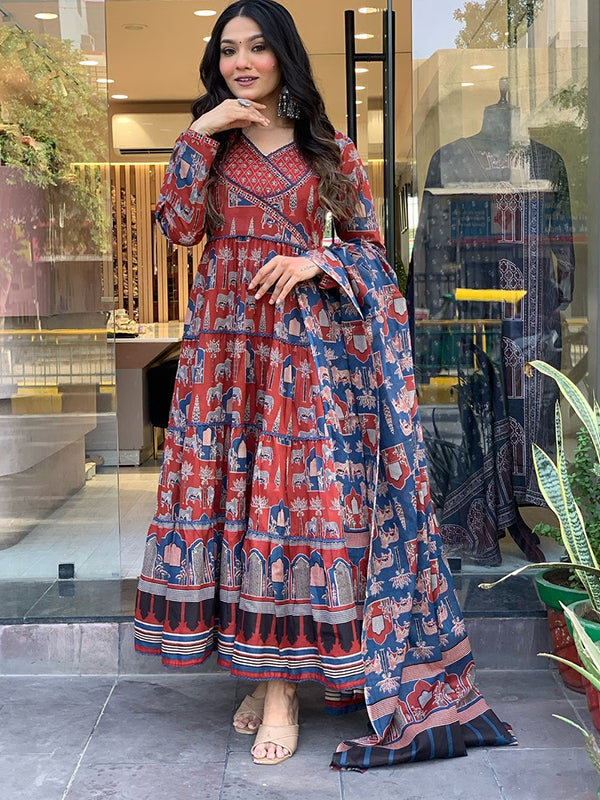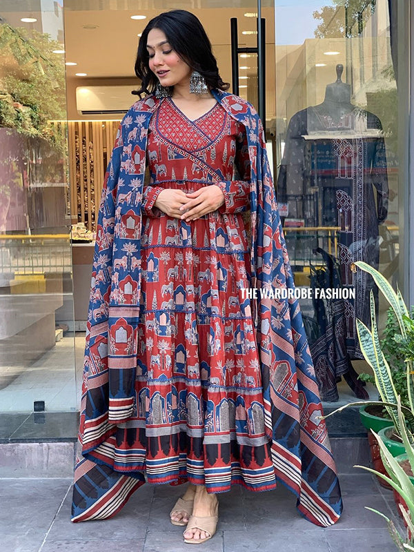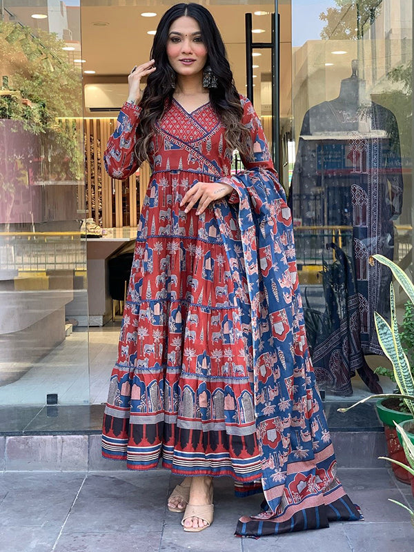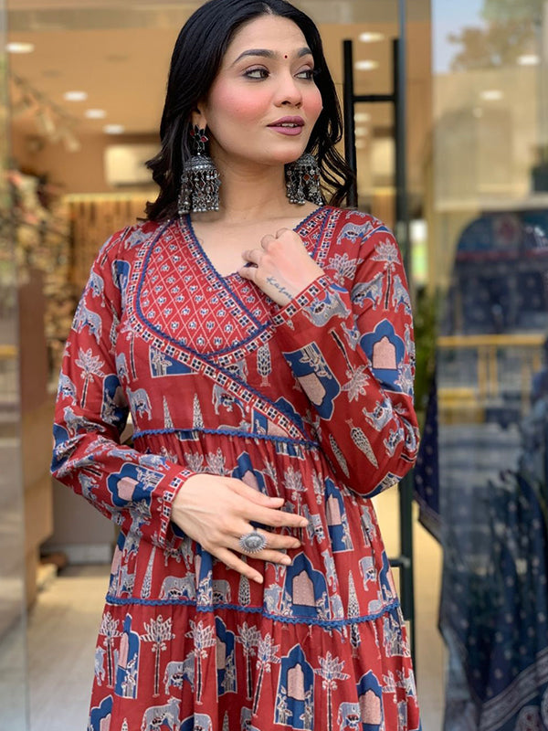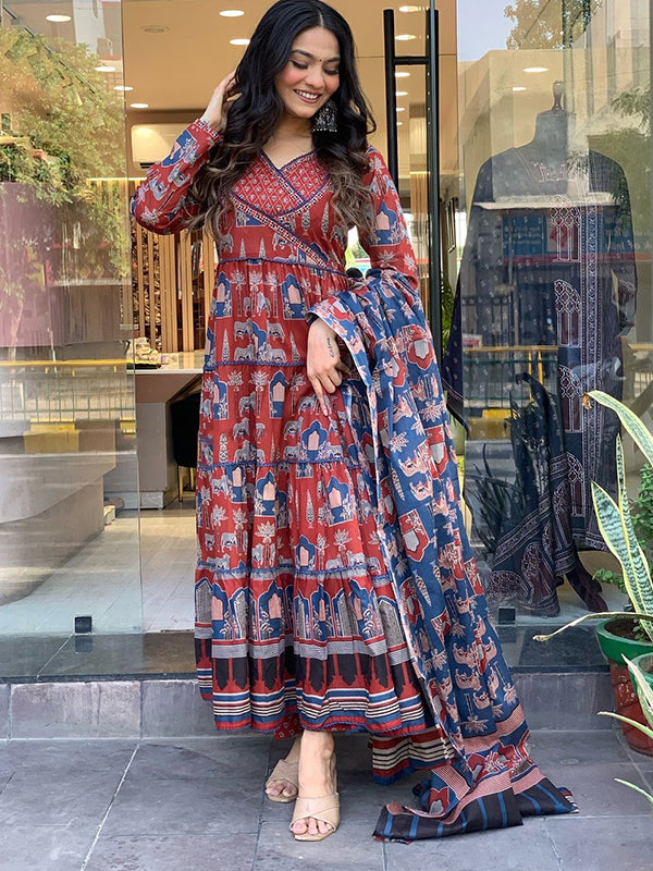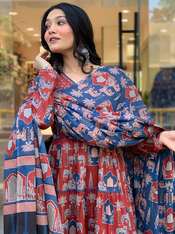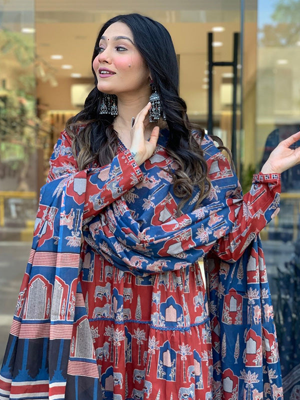 Maroon Blue Cotton Floral Printed Gown With Pant & Dupatta Set – Vamikaa
