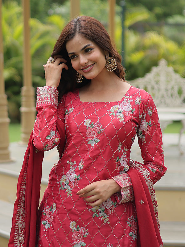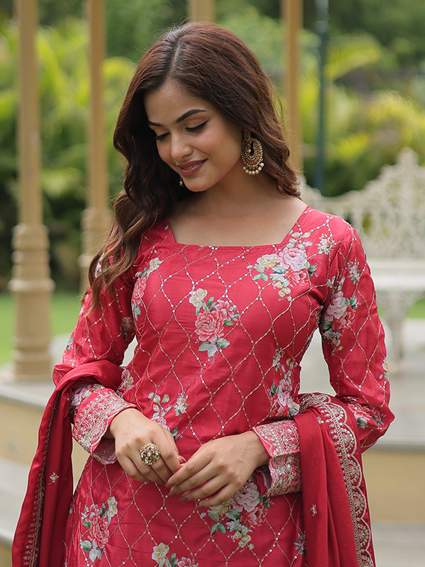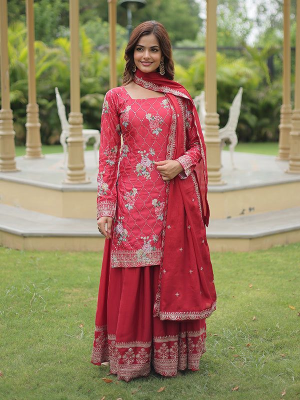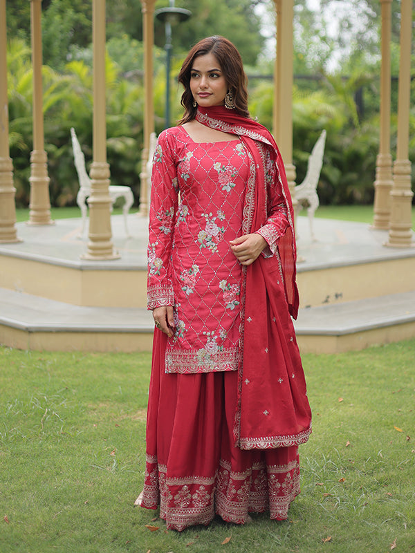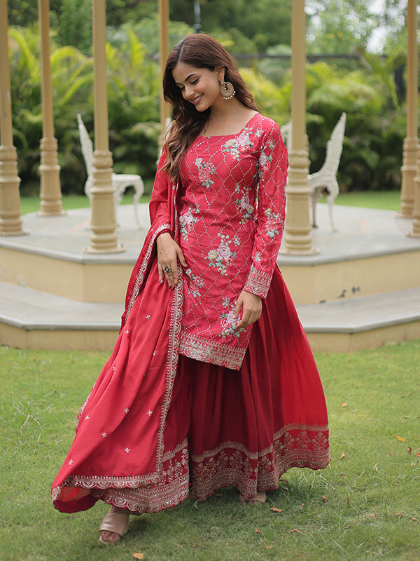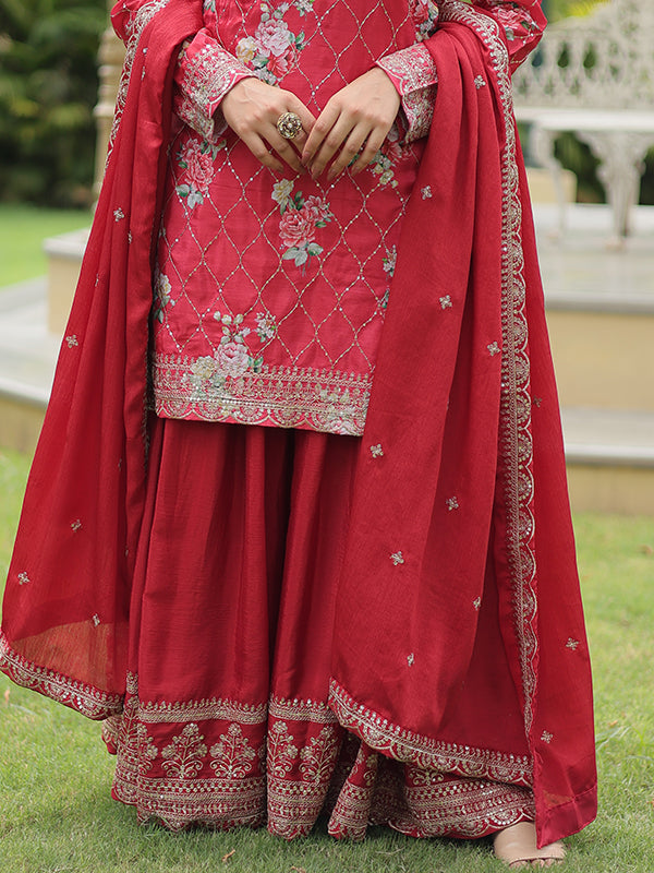 Maroon Chinnon Sequins & Embroidered Kurti With Palazzo Set