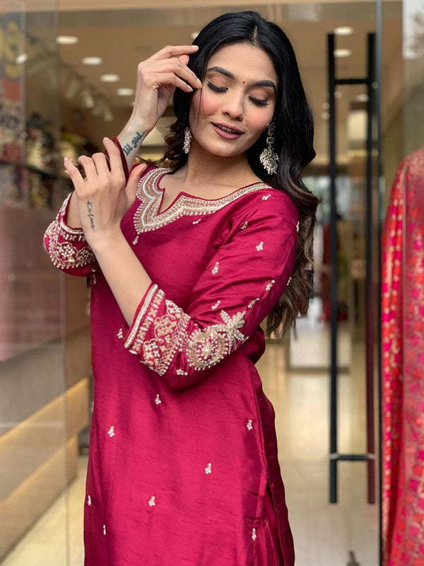 Buy Maroon Designer Nack Hand Work Tapeta Silk Kurti With Pant & Dupatta Set Online. This Kurti Is A Must Have In Every Woman's Wardrobe.