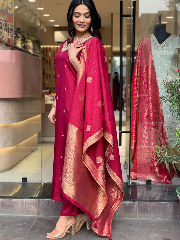 Designer Neck Hand Work Tapeta Silk Kurti With Pant & Dupatta Set – Vamikaa