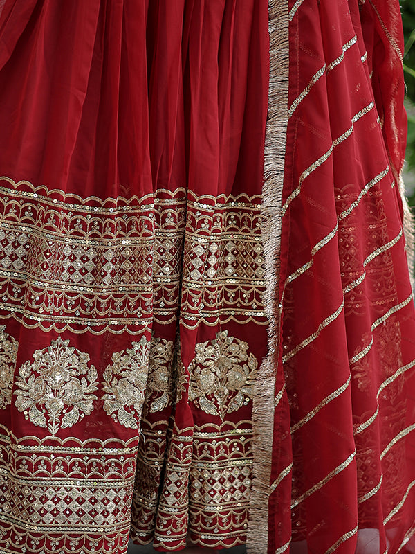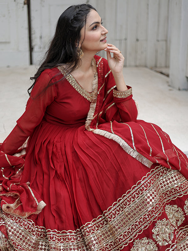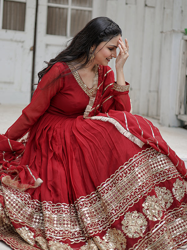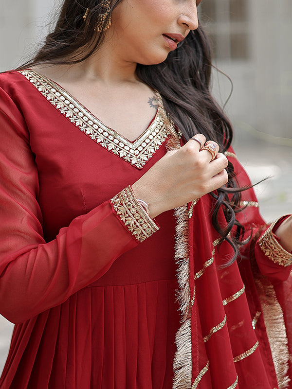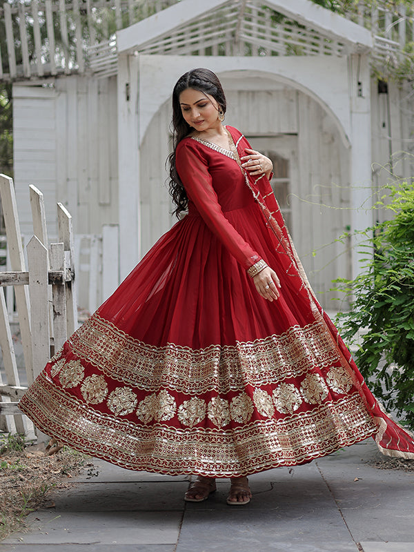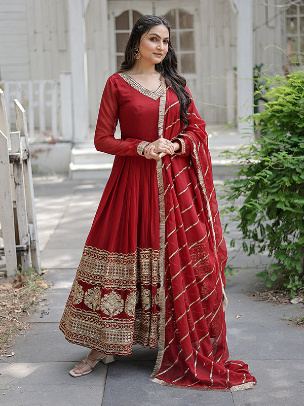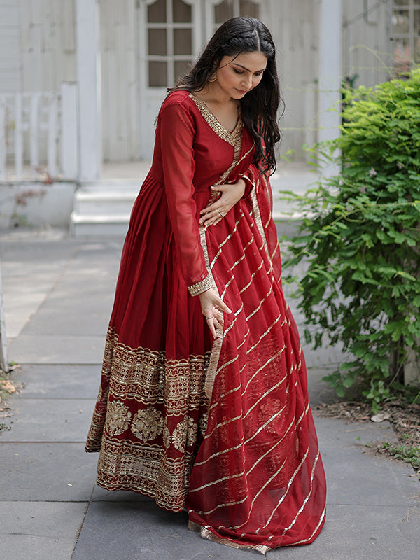 Maroon Faux Blooming Designer Lace Border Gown With Dupatta Maroon Faux Blooming Designer Lace Border Gown With Dupatta
