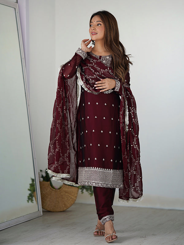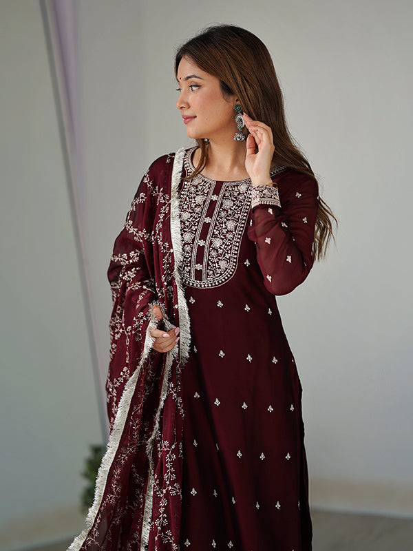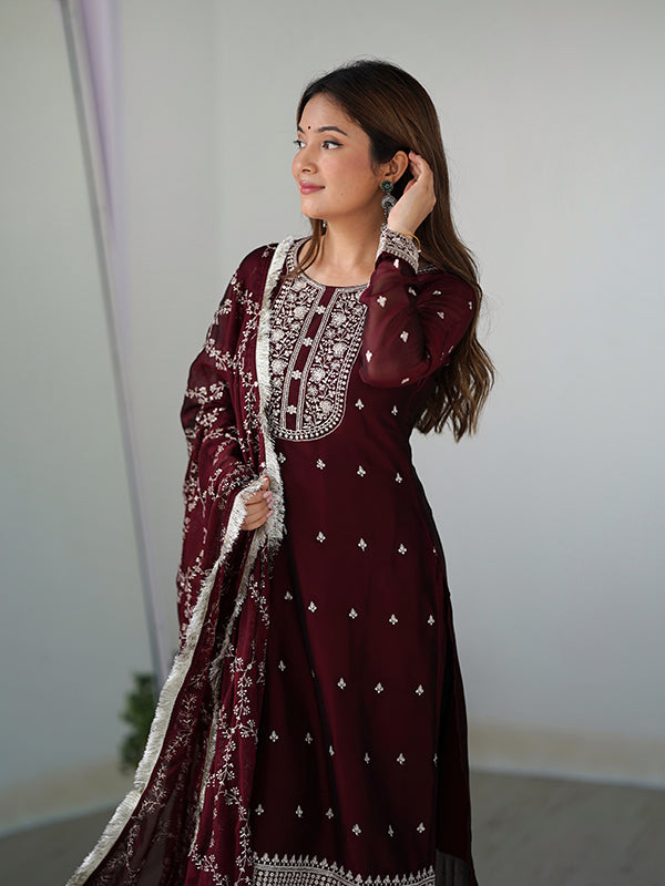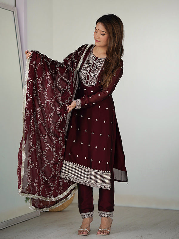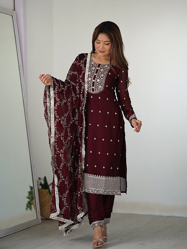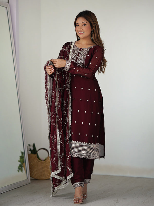Maroon Silk Embroidered Straight Kurti With Pant & Dupatta Set – Vamikaa