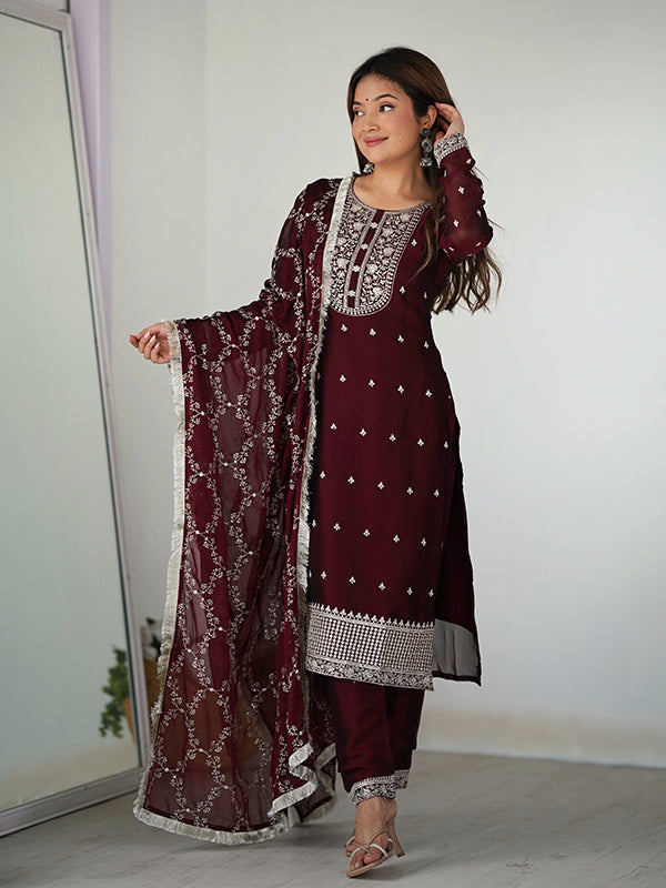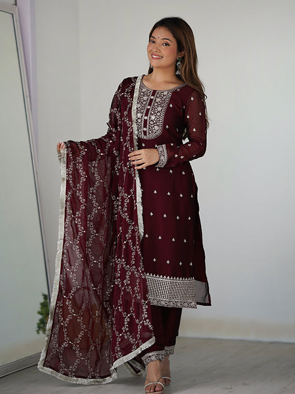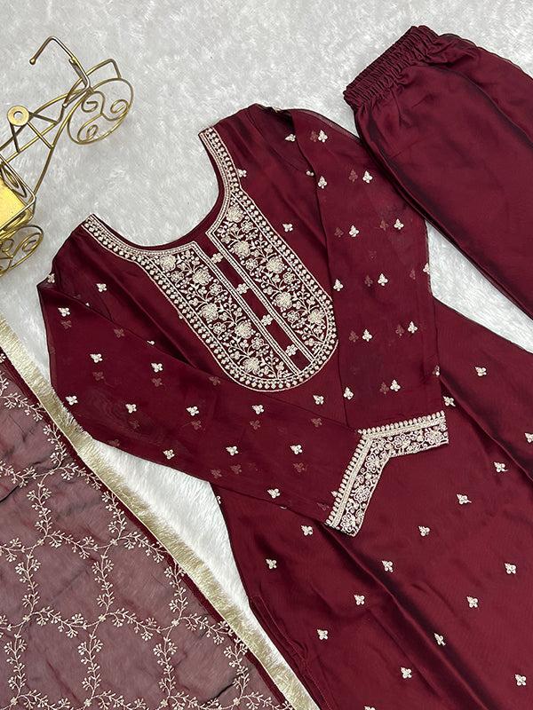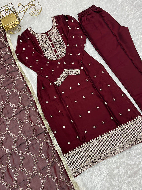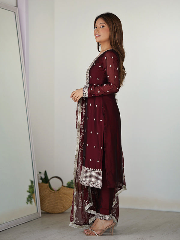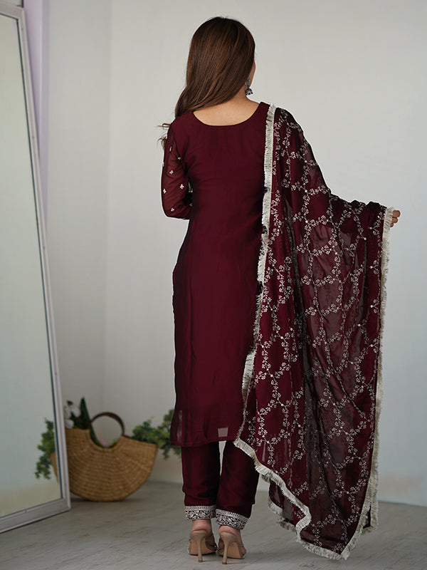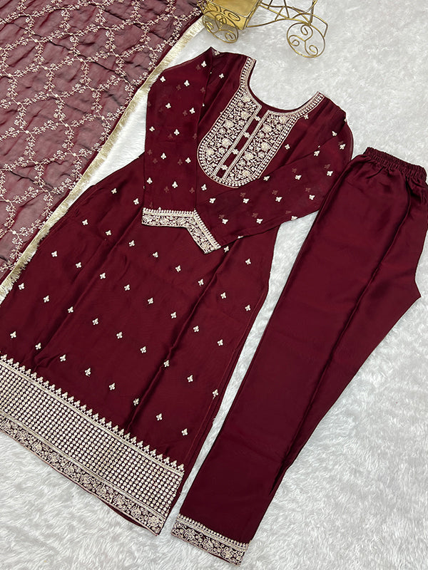 Maroon Silk Embroidered Straight Kurti With Pant & Dupatta Set – Vamikaa