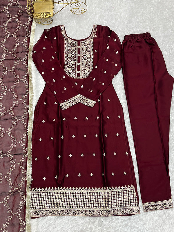 Maroon Silk Embroidered Straight Kurti With Pant & Dupatta Set
