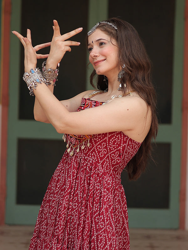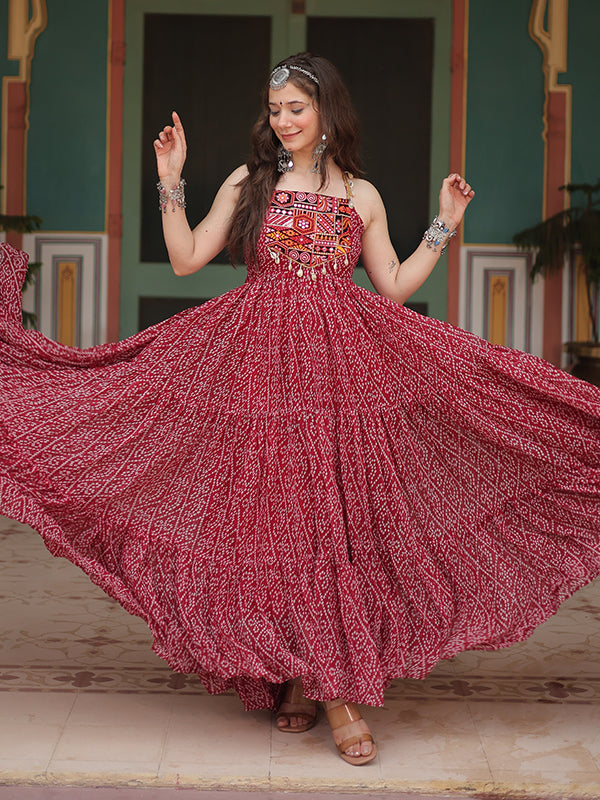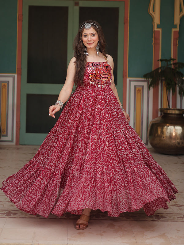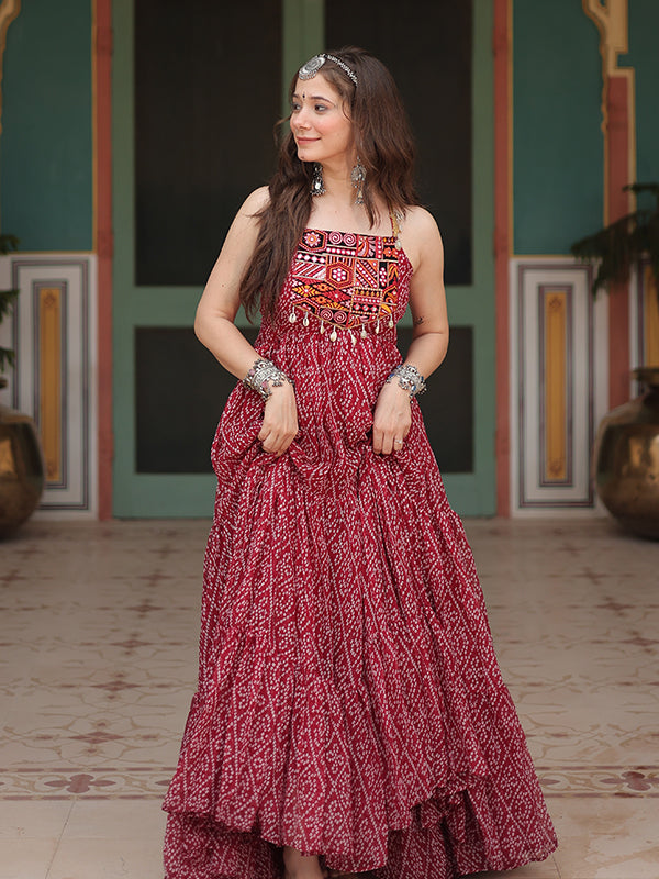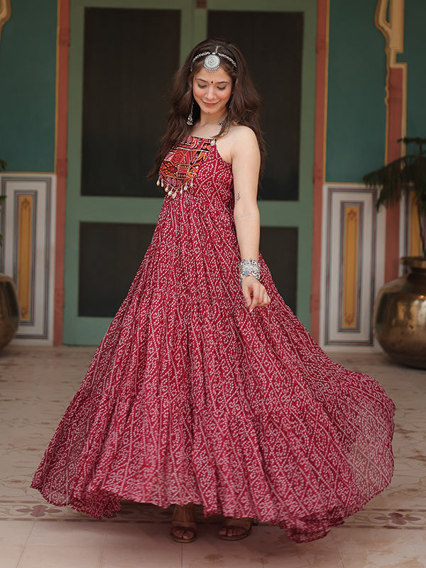 Maroon Sleeveless Georgette Bandhani Print With Kutchi Patchwork Gown Maroon Sleeveless Georgette Bandhani Print With Kutchi Patchwork Gown