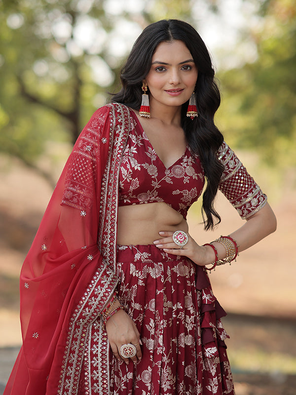Buy Maroon Viscose Jacquard With Embroidered Sequins Lehenga Choli Online. This Lehenga Choli Is A Must Have In Every Woman's Wardrobe.