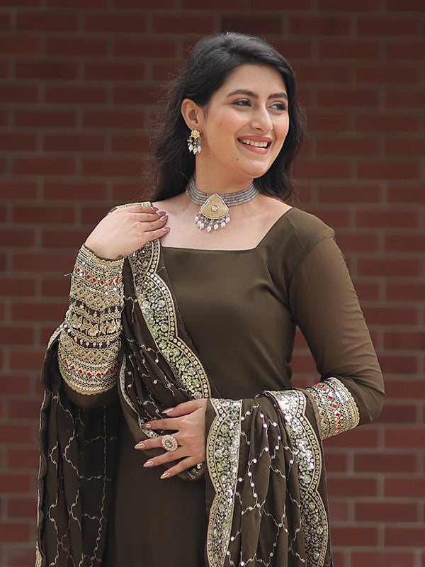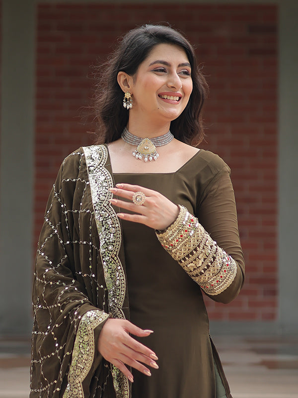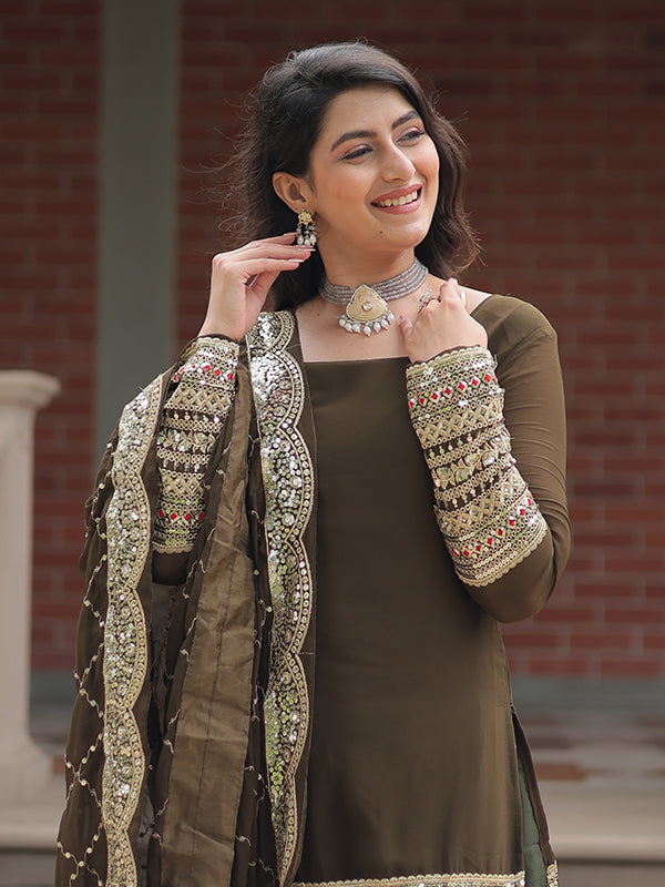 Mehndi Faux Georgette Embroidered Kurta With Sharara & Dupatta Mehndi Faux Georgette Embroidered Kurta With Sharara & Dupatta