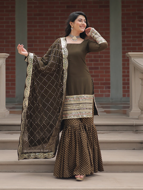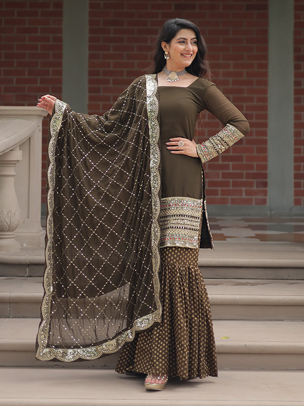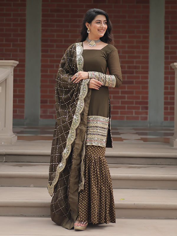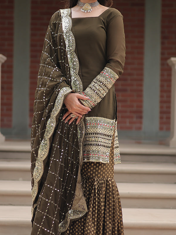 Mehndi Faux Georgette Embroidered Kurta With Sharara & Dupatta