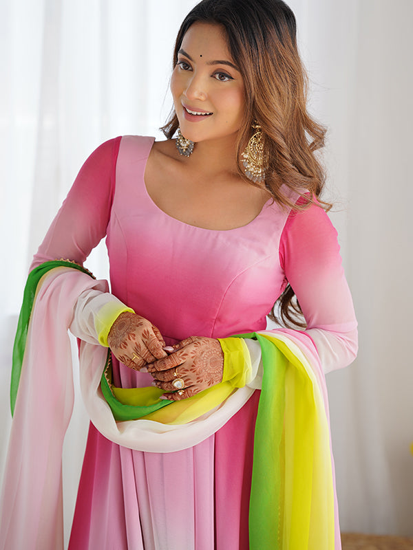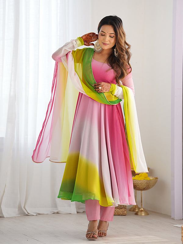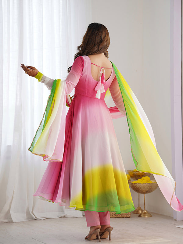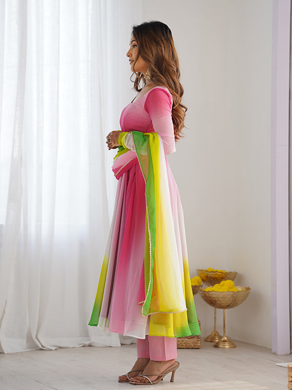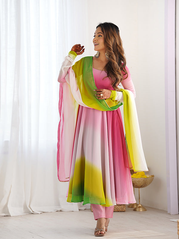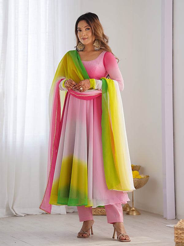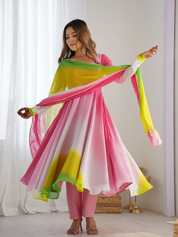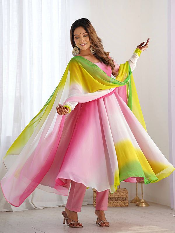 Multi Colored Anarkali Gown With Pant & Dupatta Set