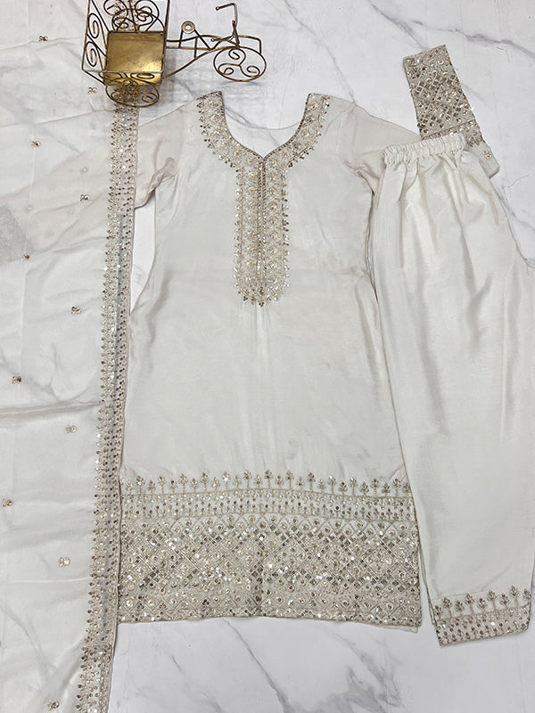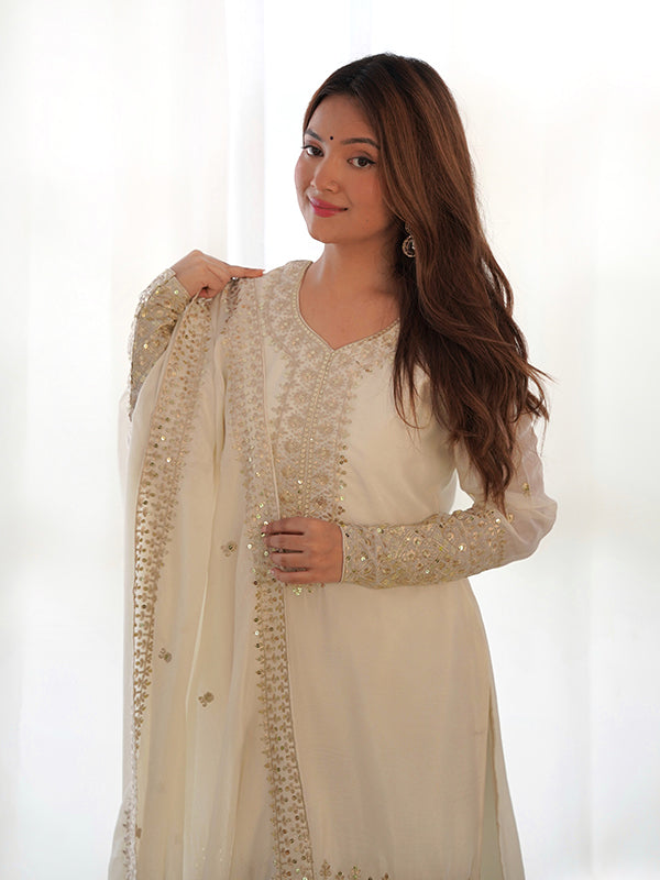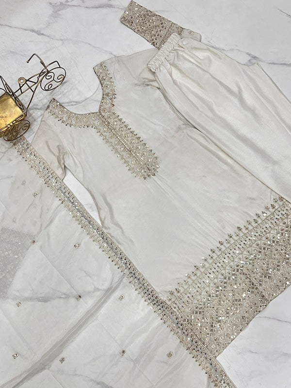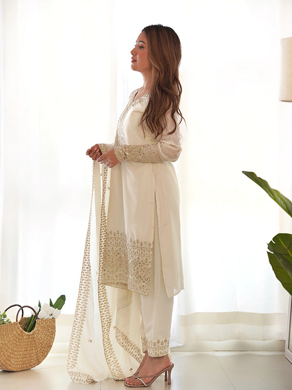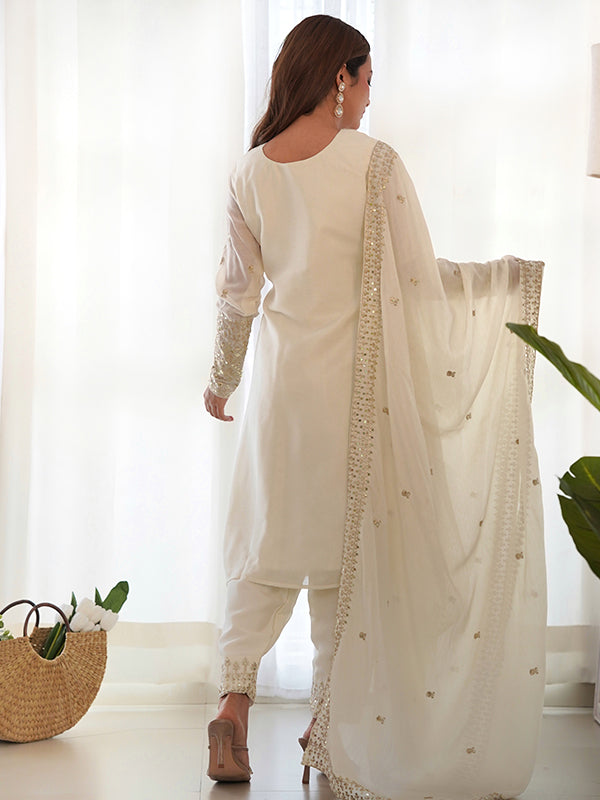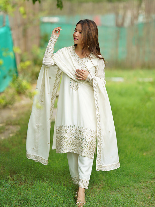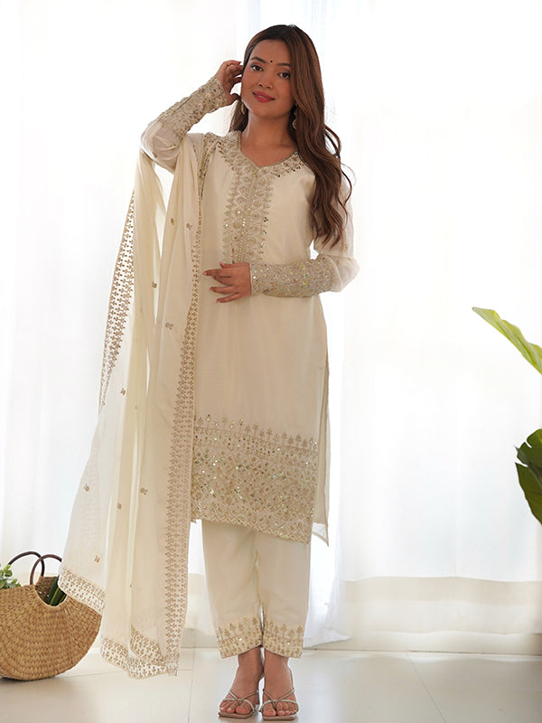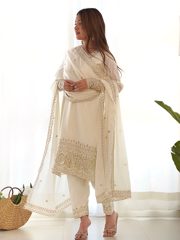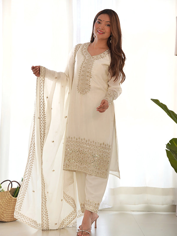 Off White Silk Embroidered Straight Kurti With Pant & Dupatta Set