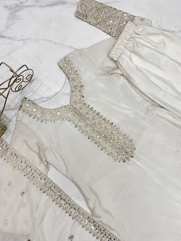 Off White Silk Embroidered Straight Kurti With Pant & Dupatta Set – Vamikaa