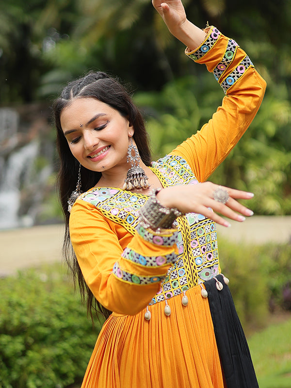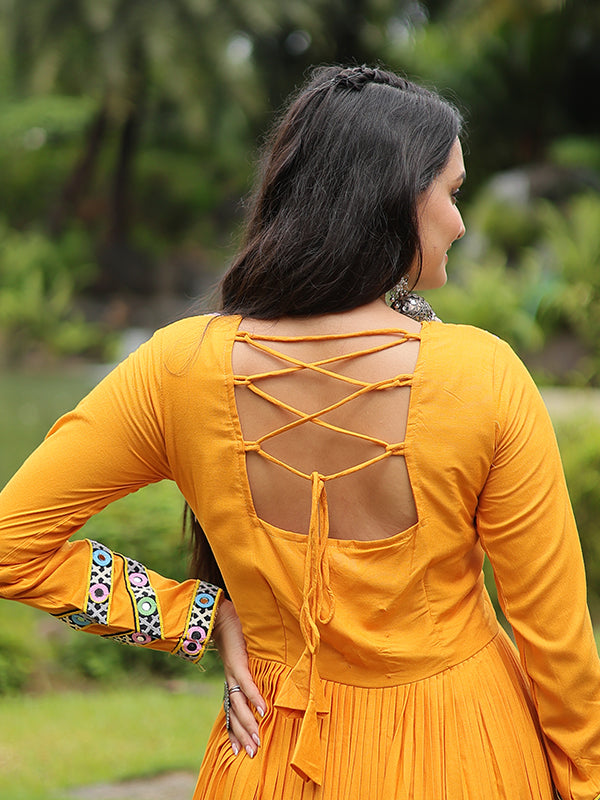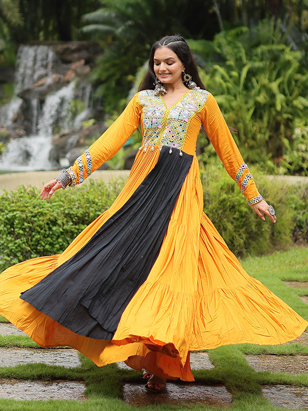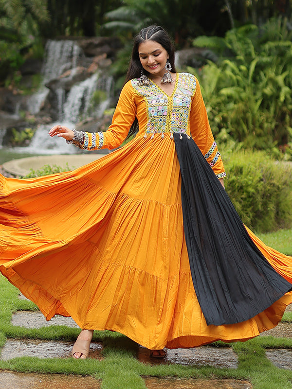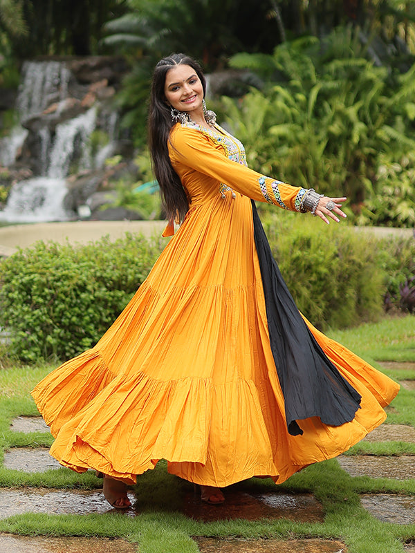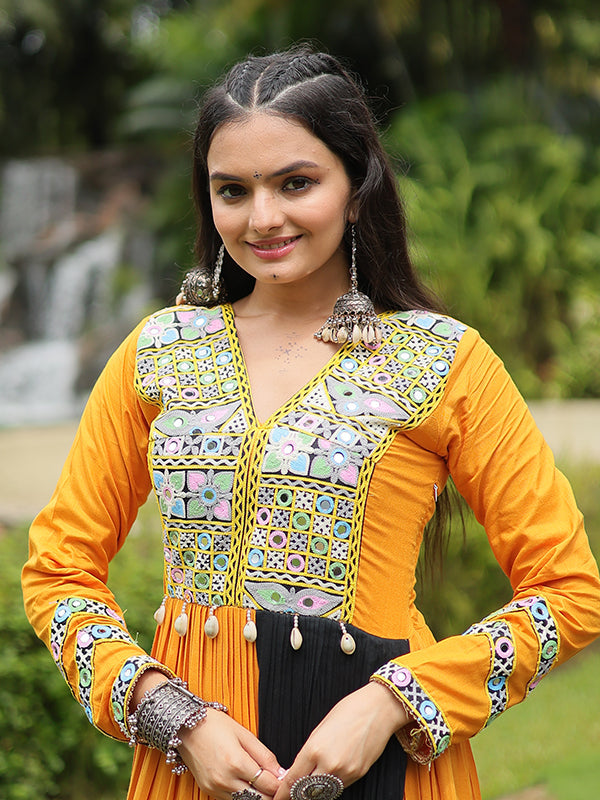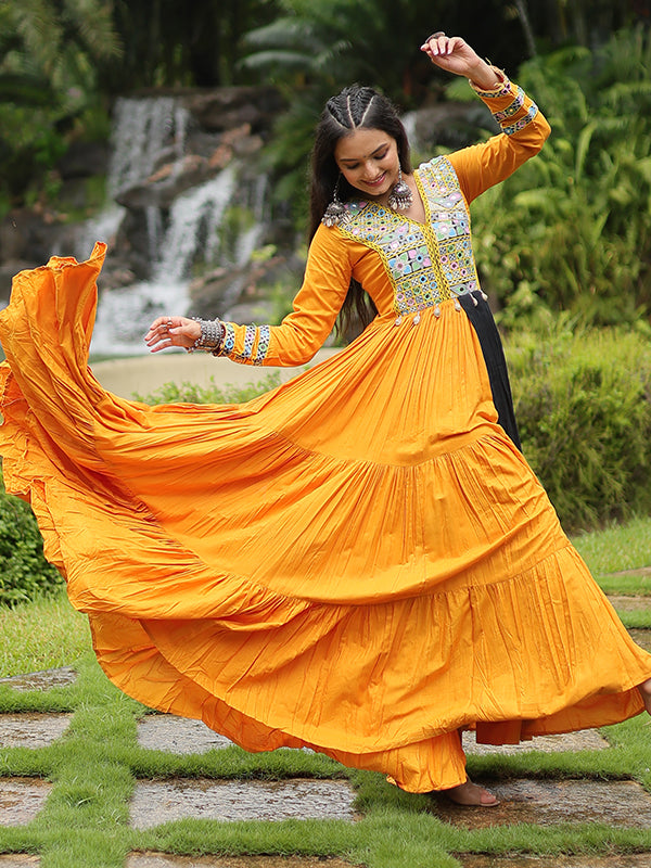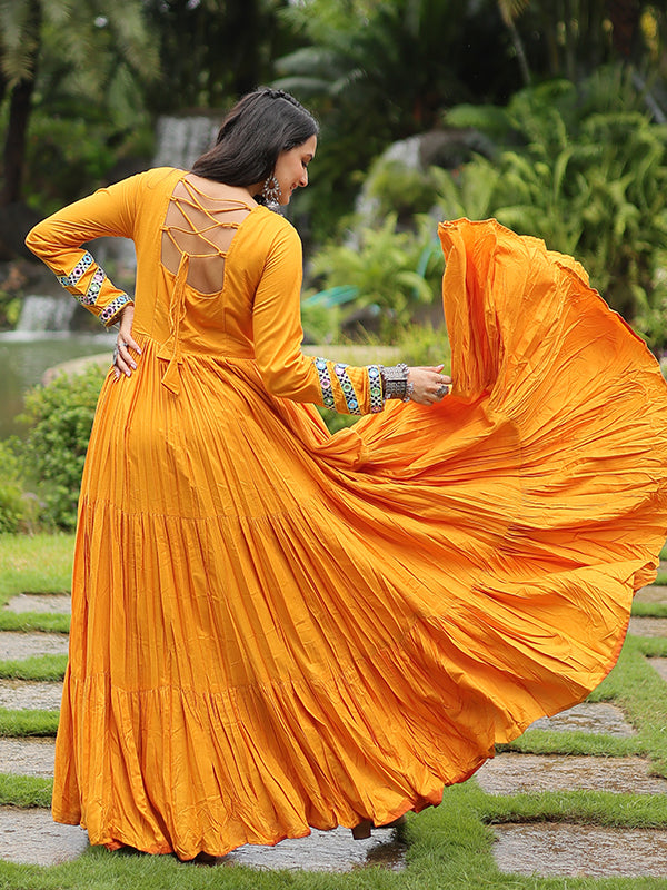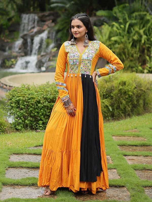 Orange Heavy Rayon Plain Layered With Kutchi Gamthi Work Gown – Vamikaa
