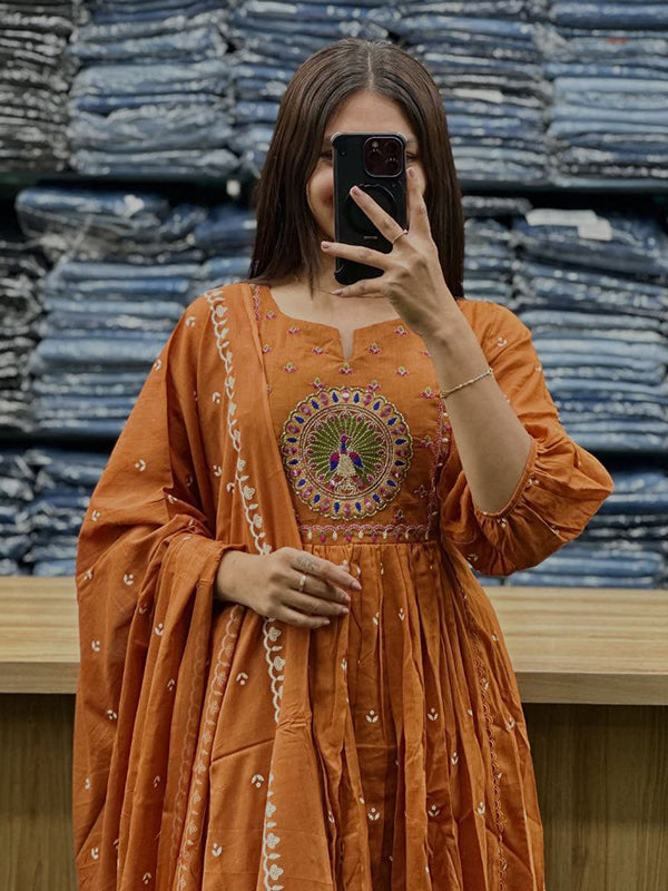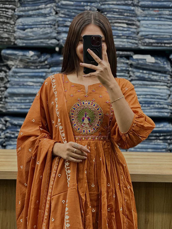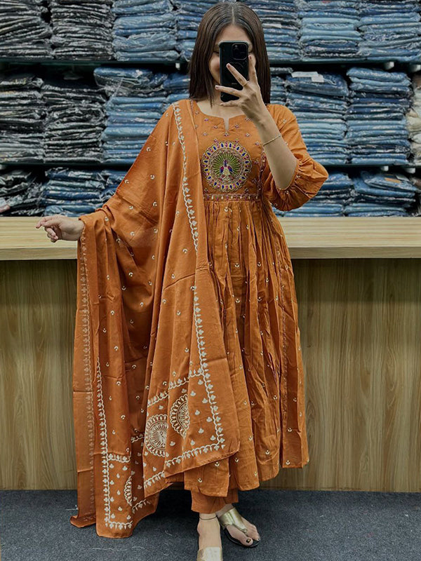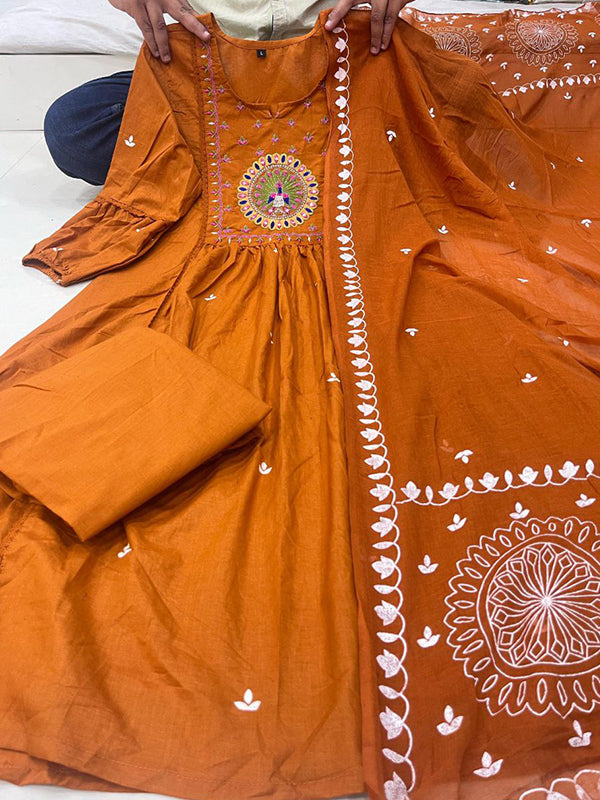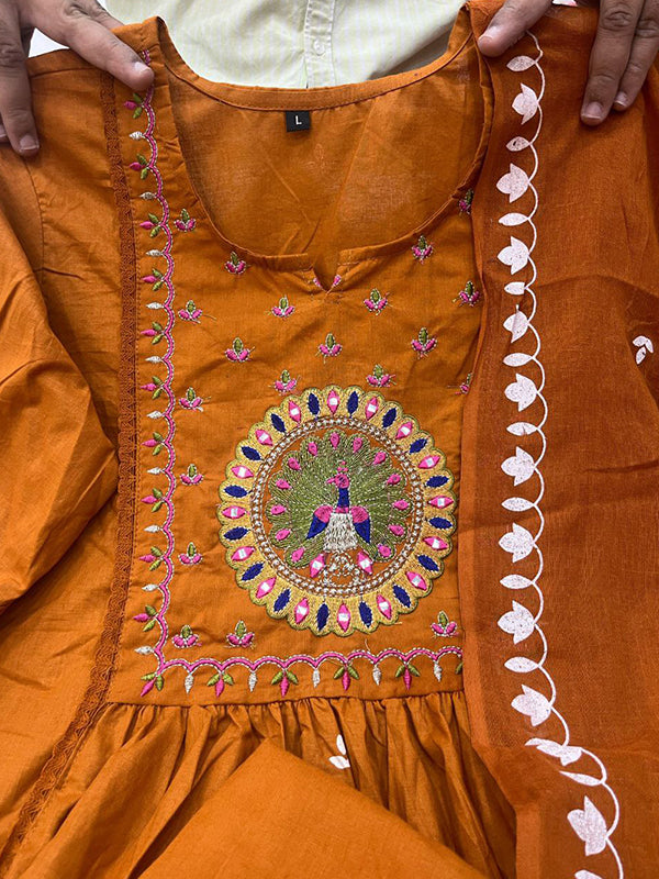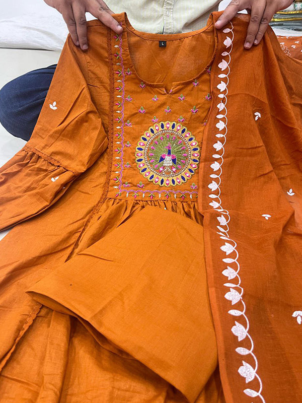 Orange Mal Cotton Pleated Kurti With Pant & Dupatta Set Orange Mal Cotton Pleated Kurti With Pant & Dupatta Set