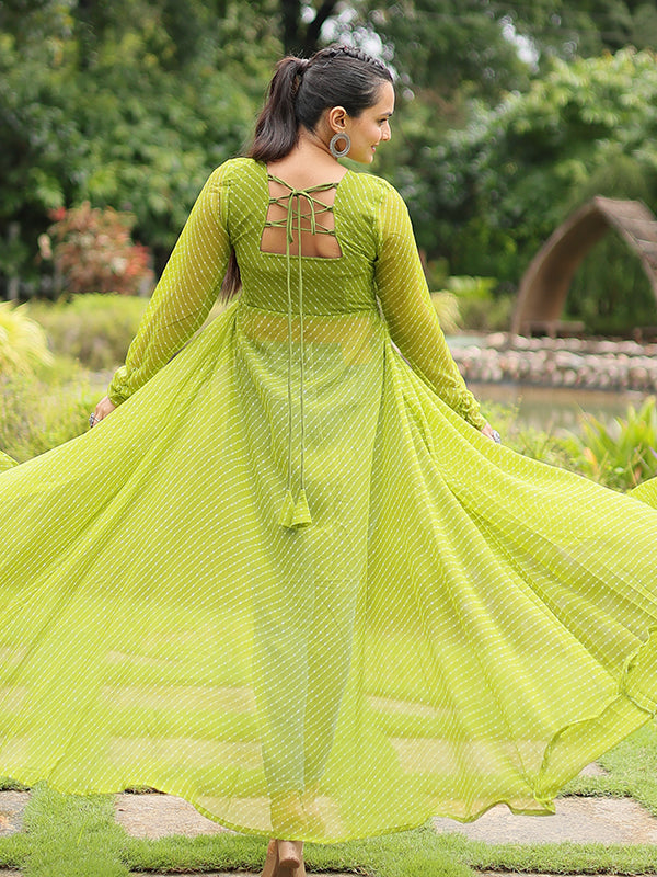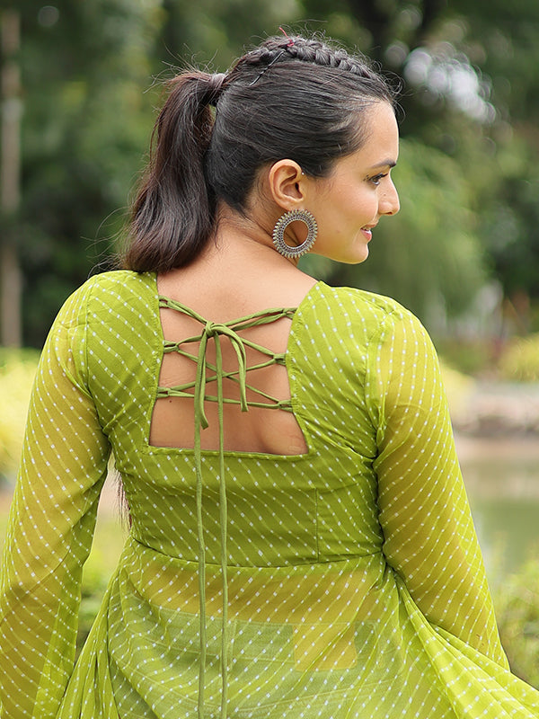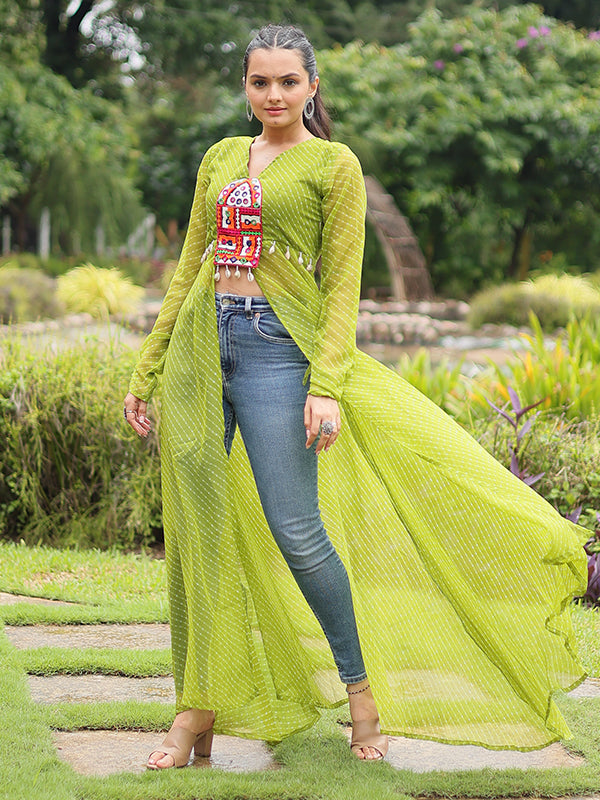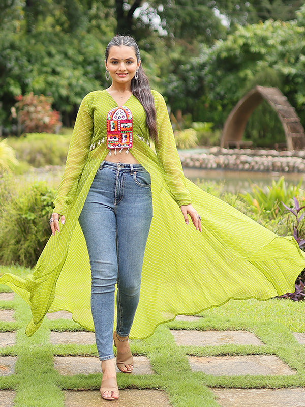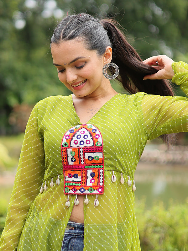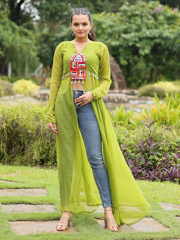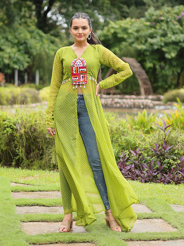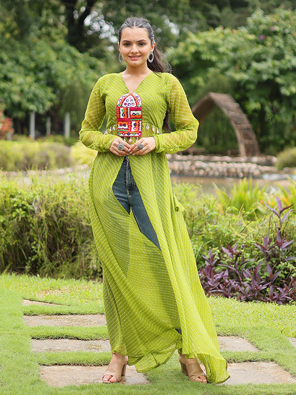 Parrot Laheriya Print With Kutchi Patchwork Front Open Long Kurti
