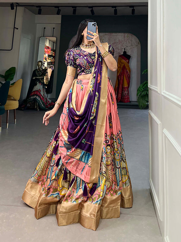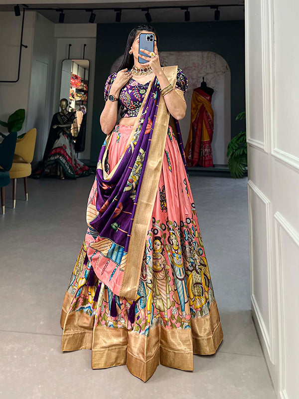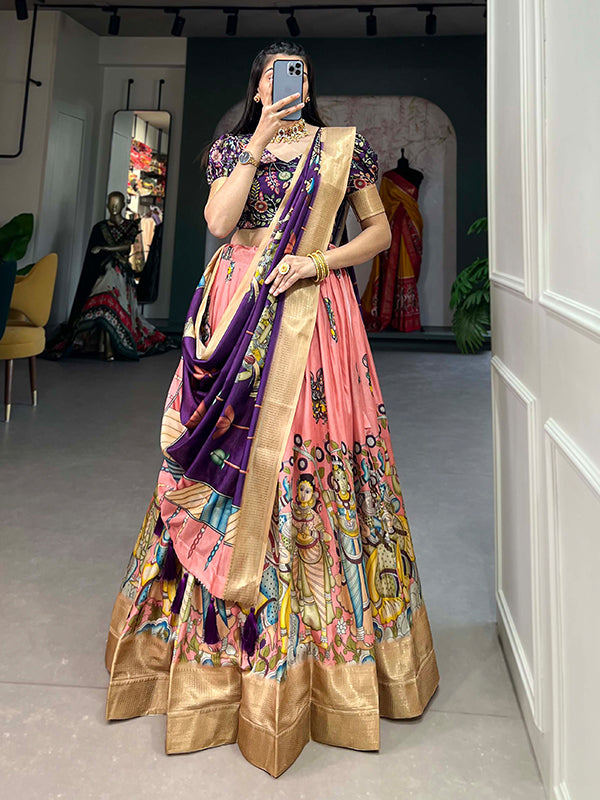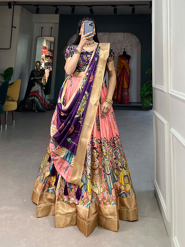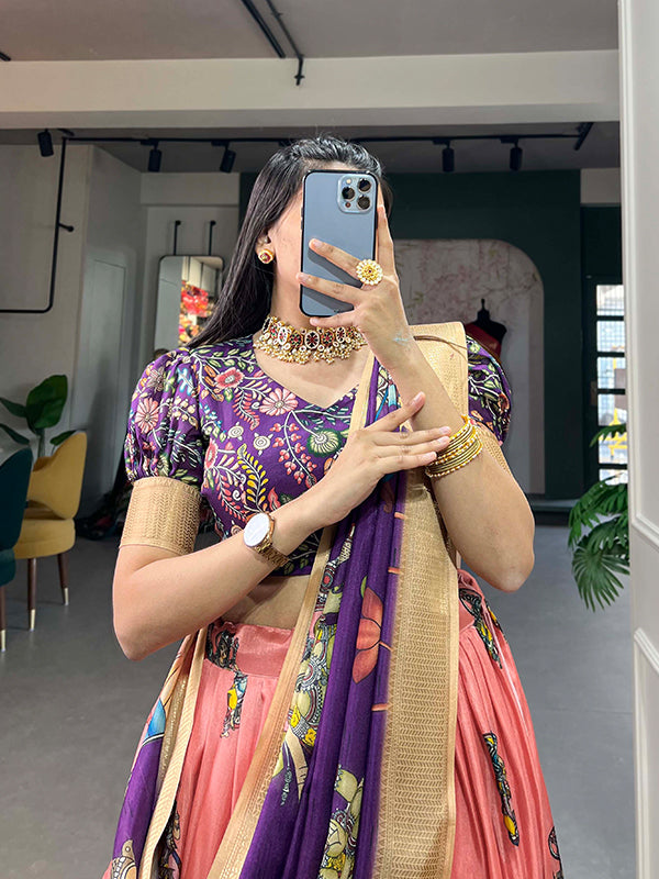 Peach Kalamkari Print Silk Lehenga Choli With Dupatta Peach Kalamkari Print Silk Lehenga Choli With Dupatta