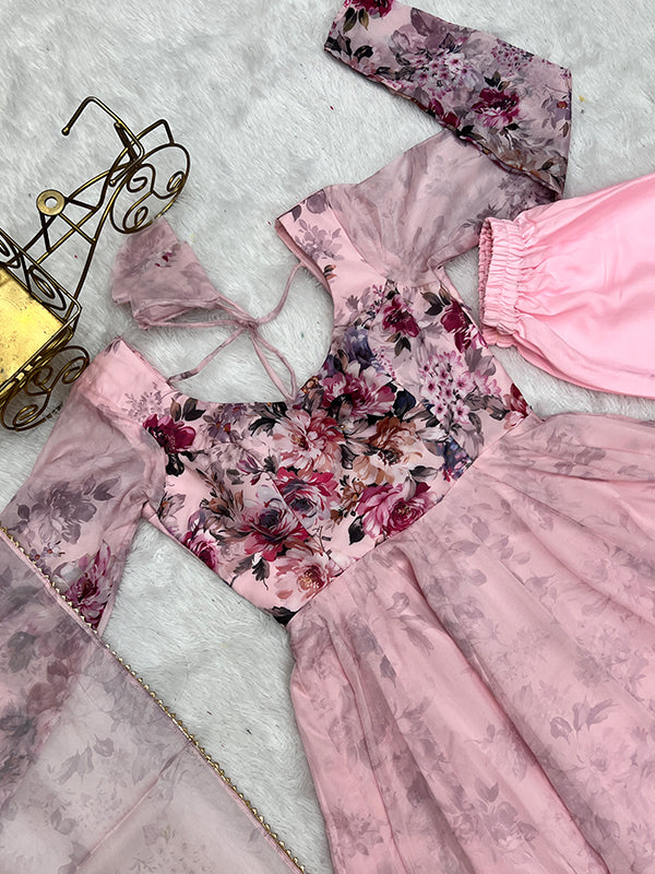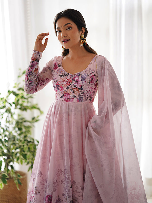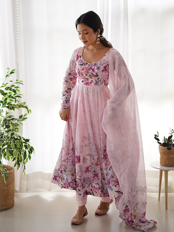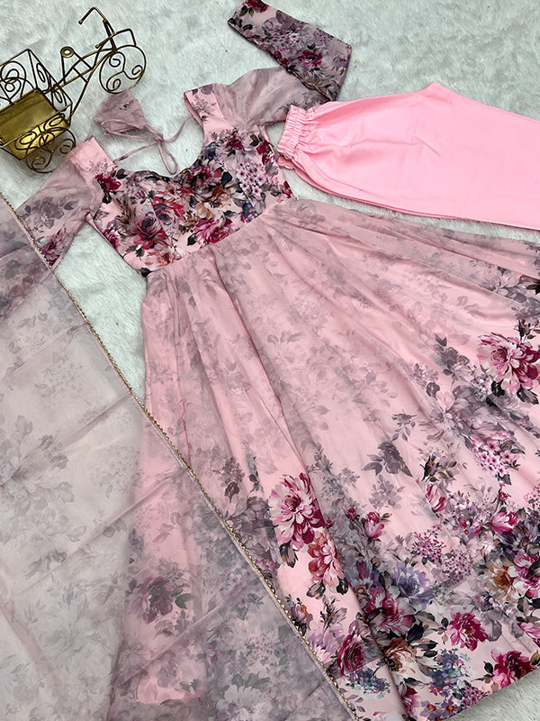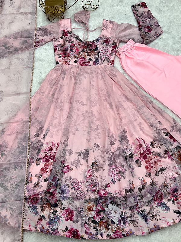 Pink Flower Printed Anarkali Kurti With Pant & Dupatta Set
