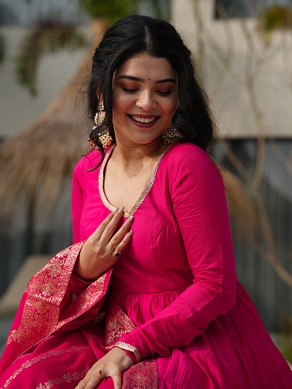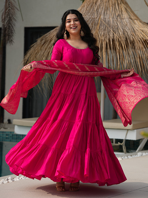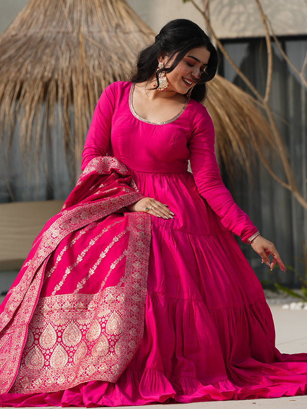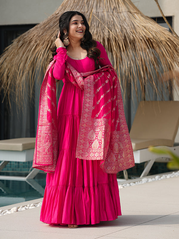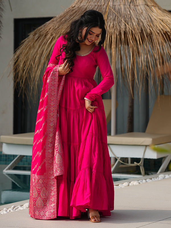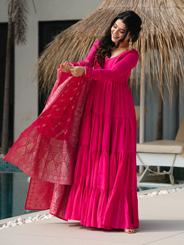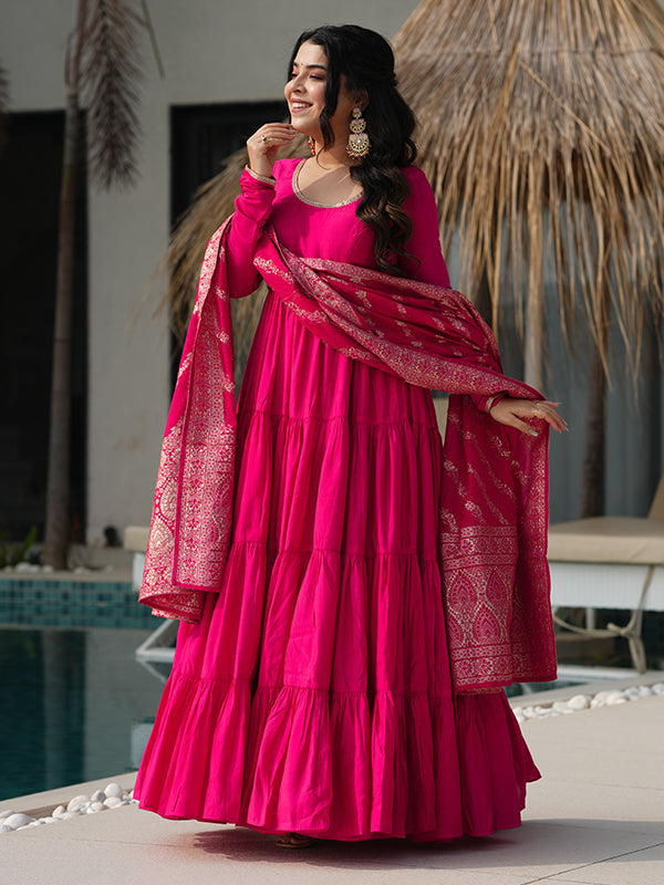 Pink Layered Plain Anarkali Gown With Pant & Dupatta Set – Vamikaa
