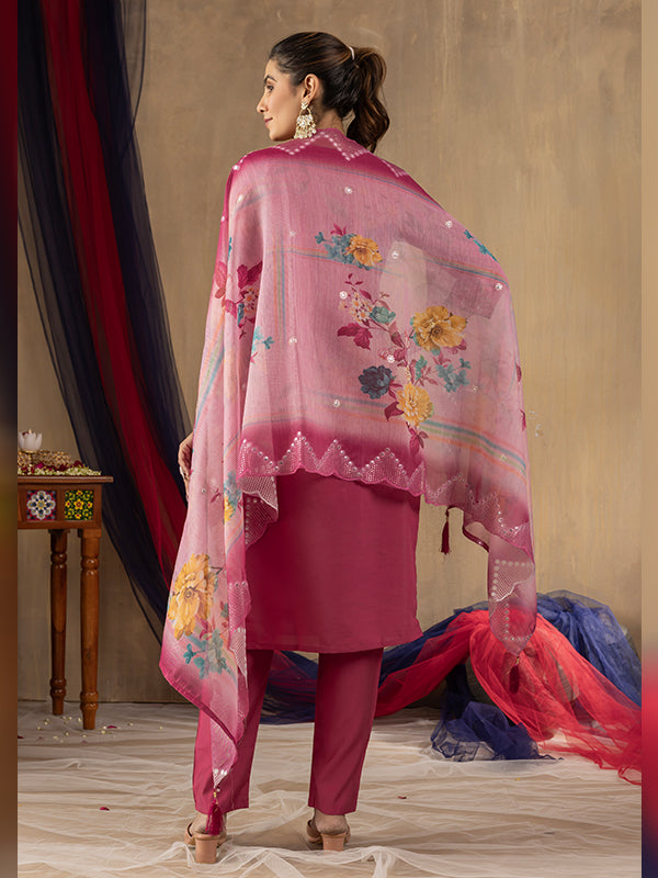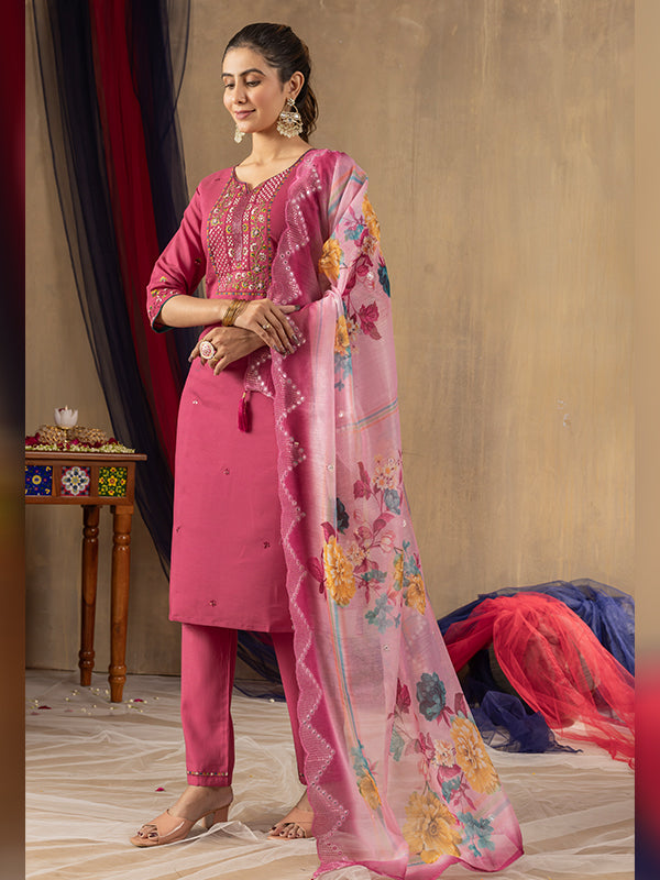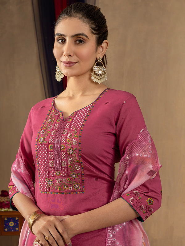 Pink Roman Silk Embroidered With Hand Work Suit Set Pink Roman Silk Embroidered With Hand Work Suit Set