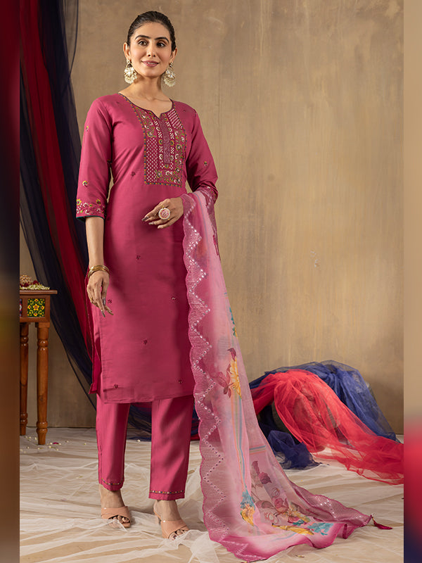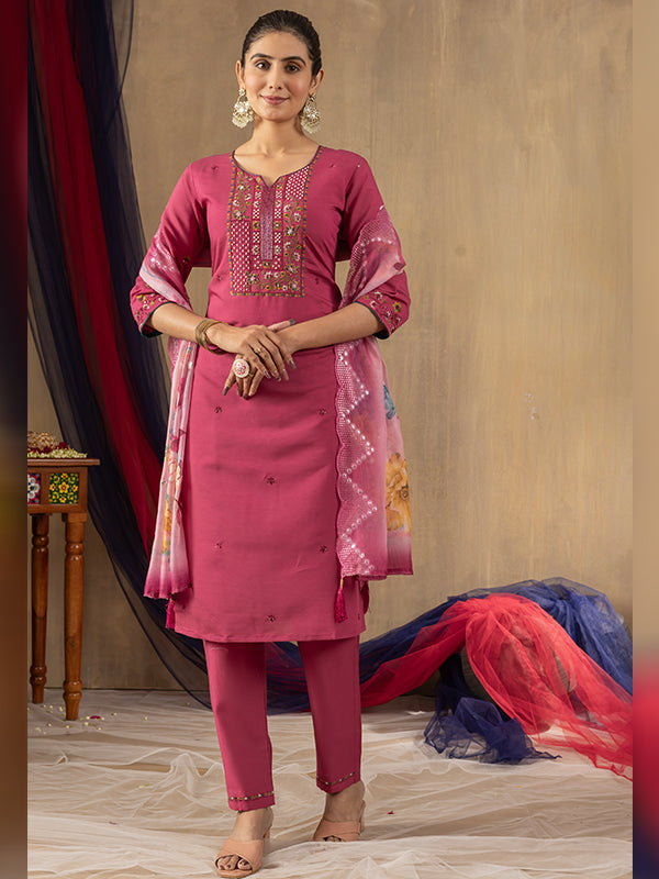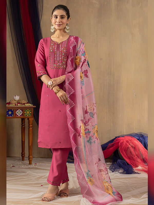 Pink Roman Silk Embroidered With Hand Work Suit Set – Vamikaa