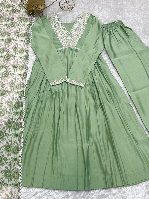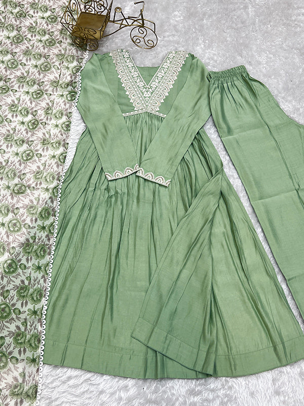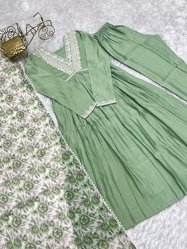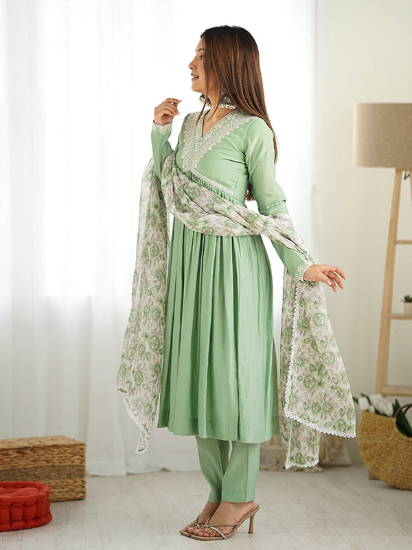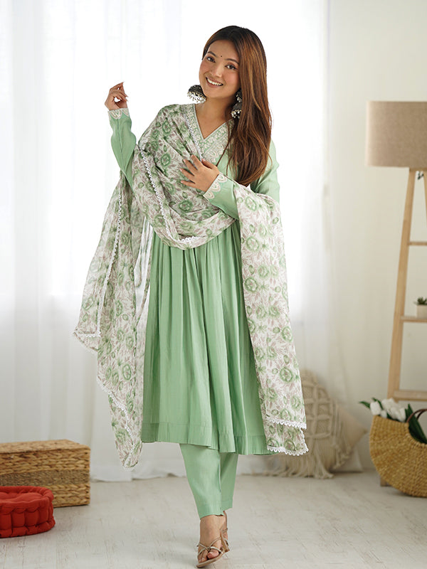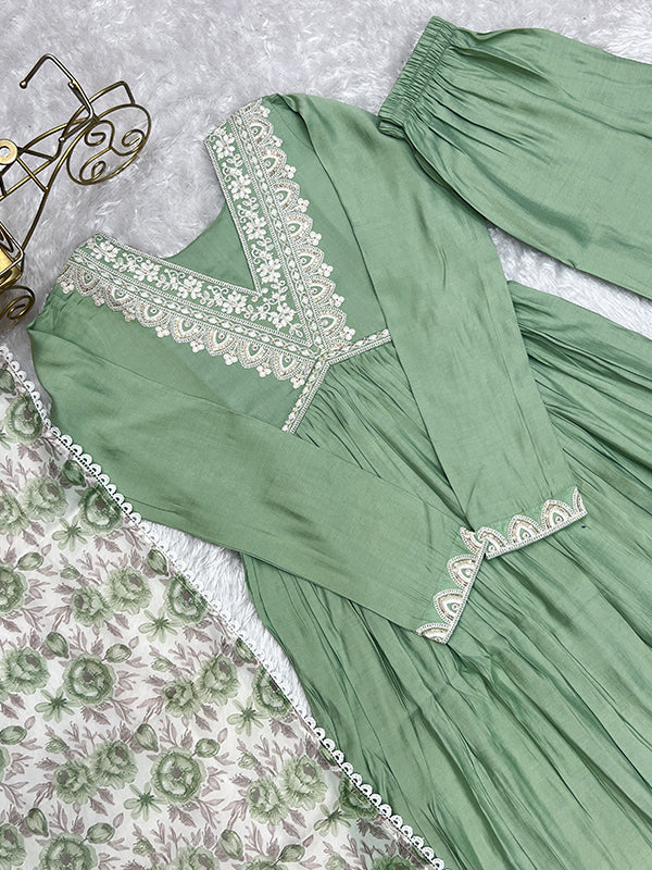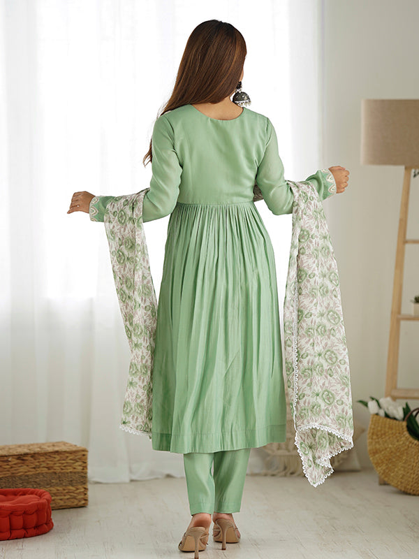 Pista Embroidered Anarkali Gown With Pant & Dupatta Set