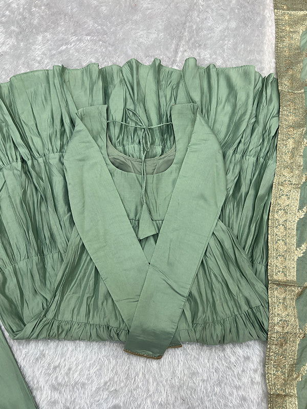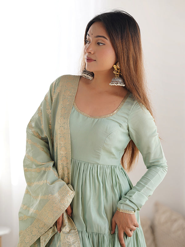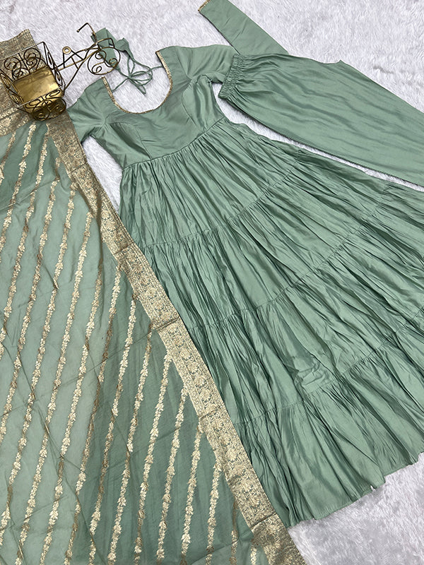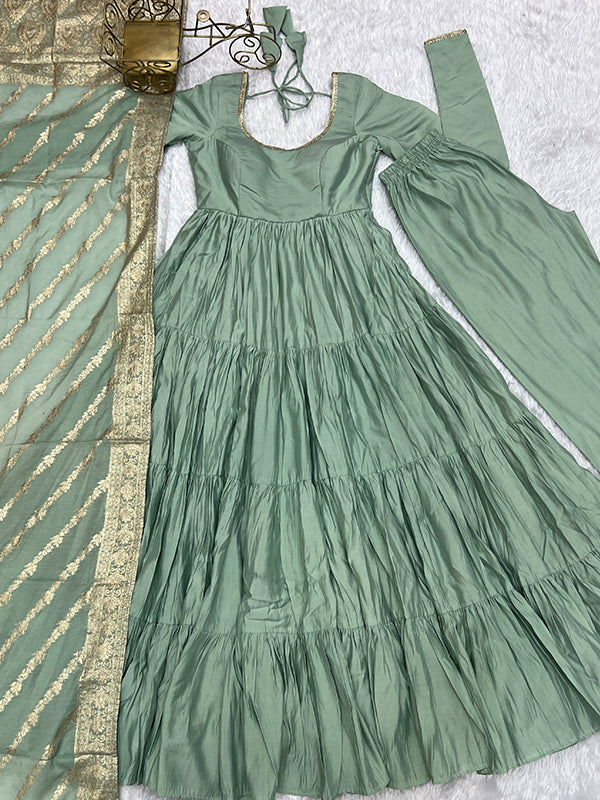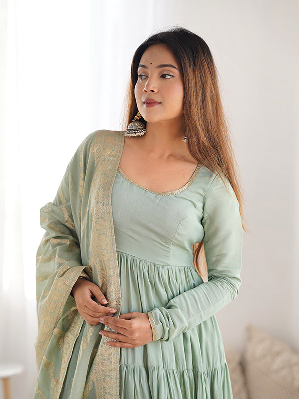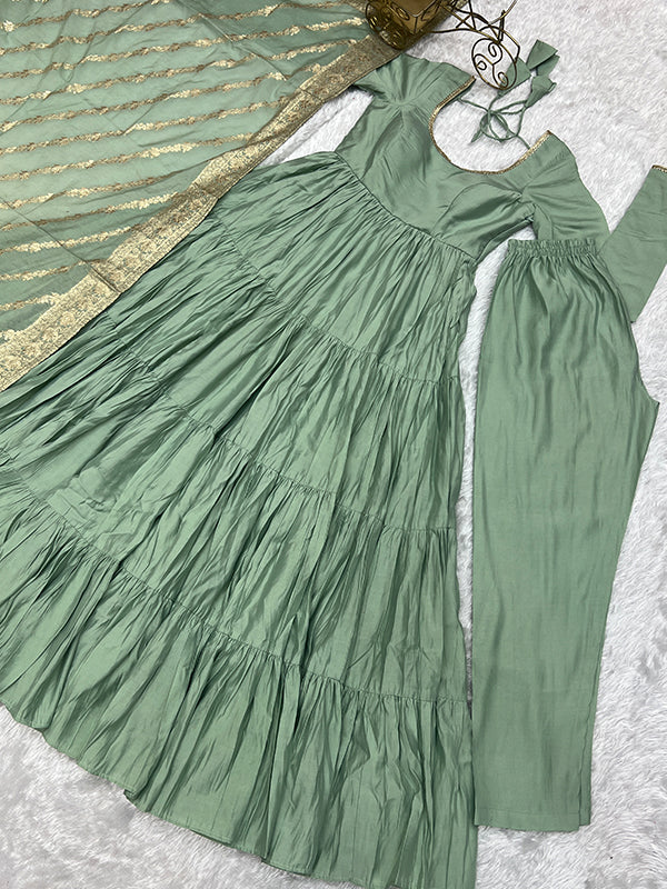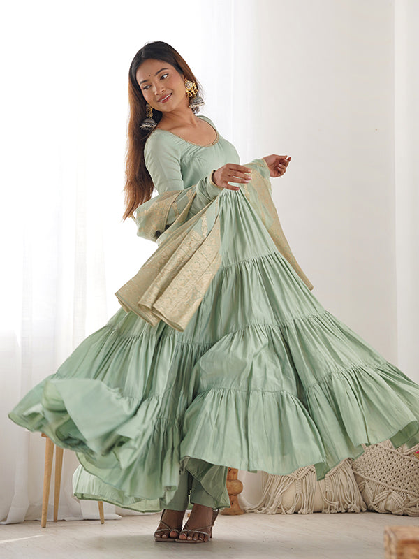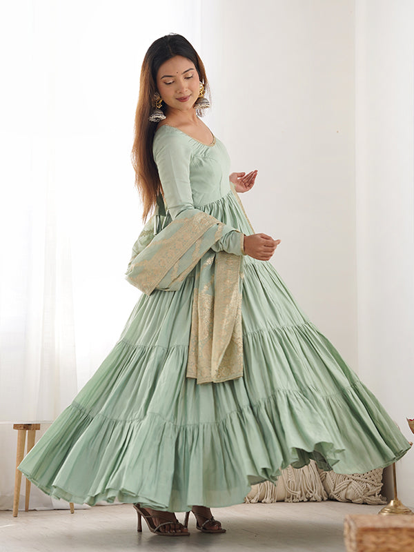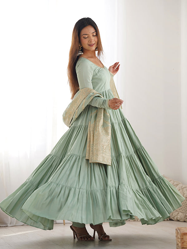 Pista Layered Plain Anarkali Gown With Pant & Dupatta Set