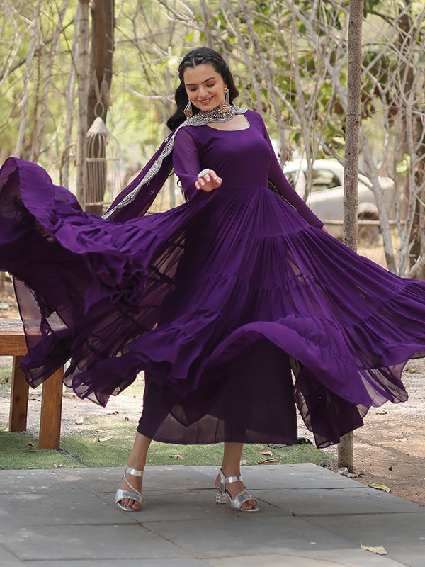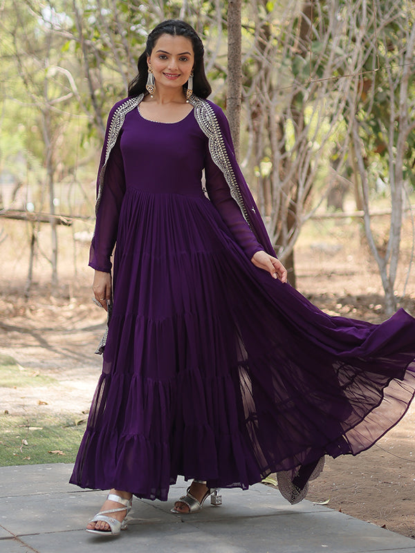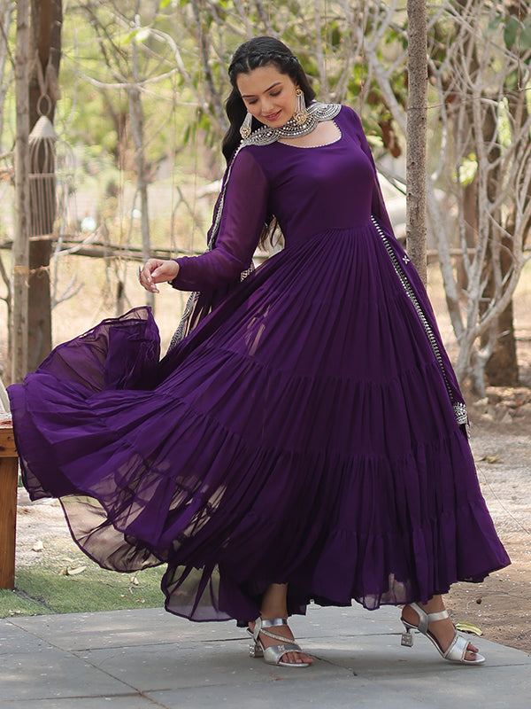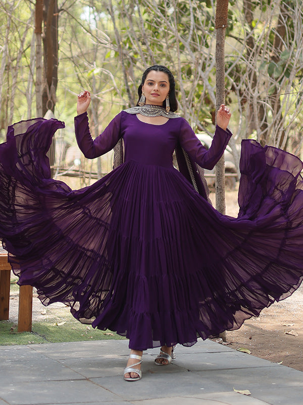 Purple Faux Blooming Plain Gown With Sequins Work Dupatta