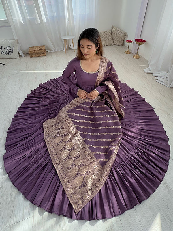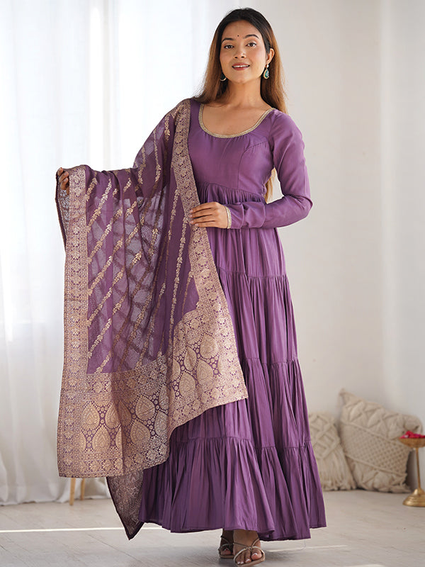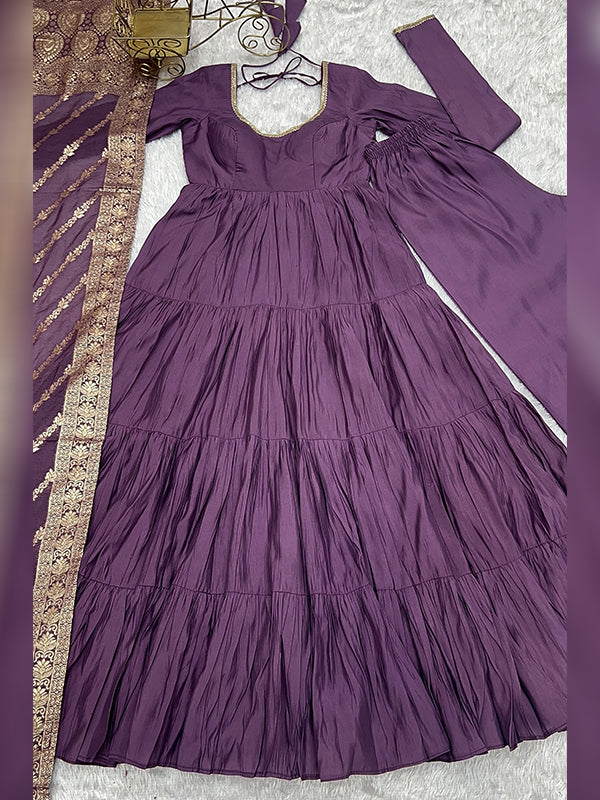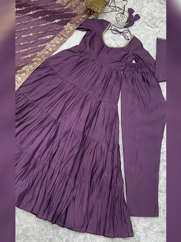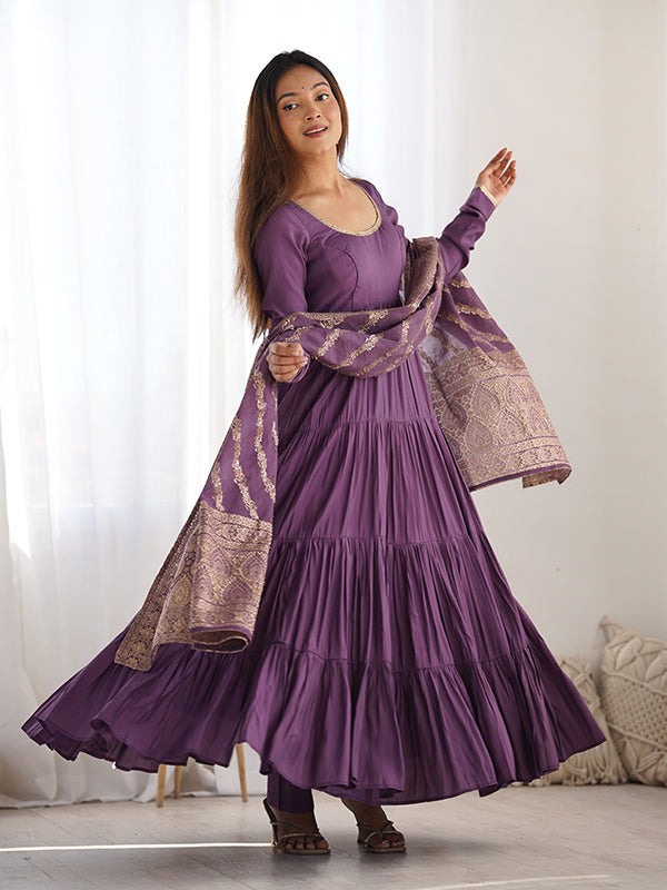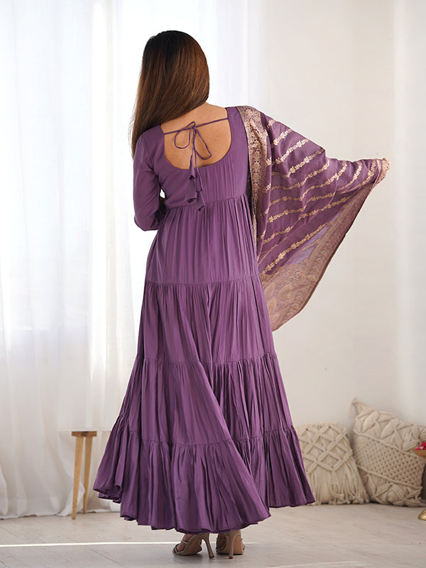 Mauve Layered Plain Anarkali Gown With Pant & Dupatta Set – Vamikaa